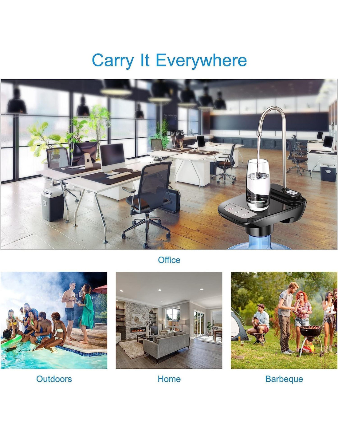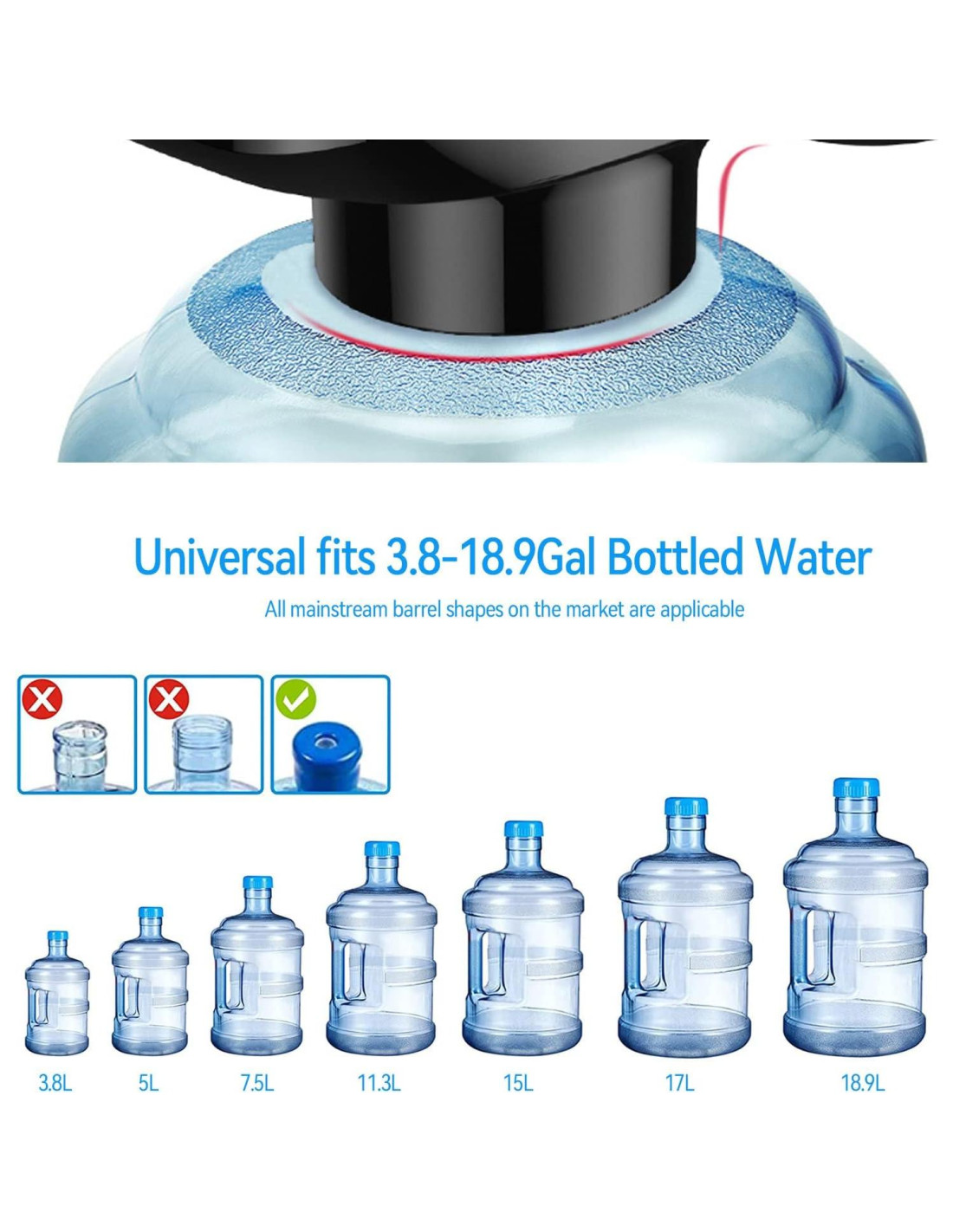 - Se puede instalar con casi cualquier botella de agua de 3.8L/5L/7.5L/11.3L/15L/17L/18.9L (más adecuada para el tipo de botella de corona de 52mm-55mm), diseñada para agua pura, agua mineral y otros usuarios de agua embotellada.