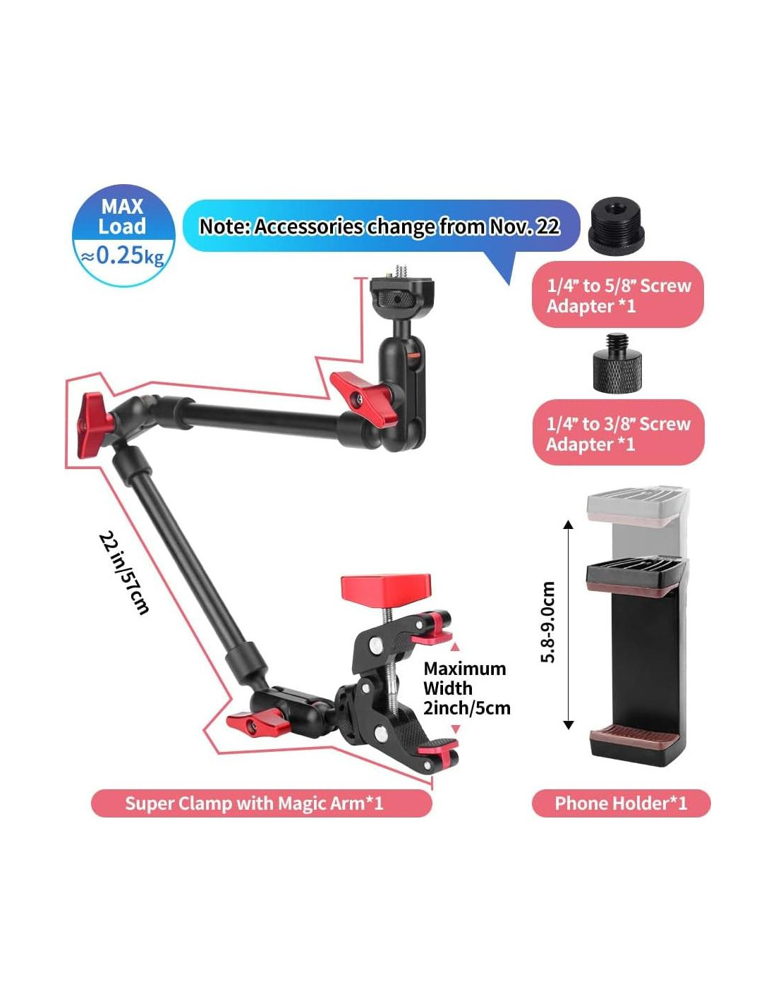 - Contenido de la caja: 1x Brazo Mágico de Fricción Articulado Ajustable de 22" (57 cm), 1x Super Abrazadera, 1x Soporte para Teléfono, 1x Adaptador de Tornillo de 1/4" a 3/8", 1x Adaptador de Tornillo de 1/4" a 5/8"