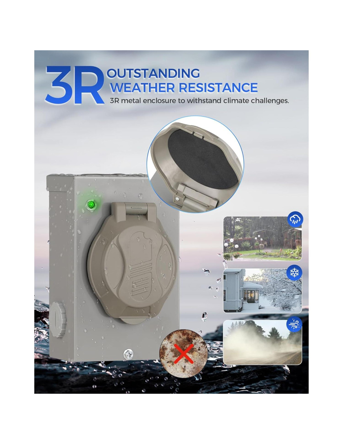 - Enclosure 3R: La caja de entrada de generador de 50 Amp está hecha de acero galvanizado 3R, proporciona un recinto robusto que soporta viento, lluvia, nieve y hielo. Su excelente resistencia a la intemperie la convierte en una opción ideal para energía de emergencia durante condiciones climáticas adversas