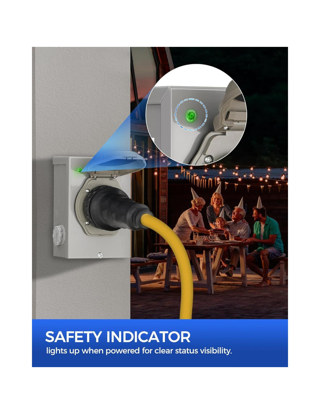 - Luz indicadora de seguridad: La caja de entrada de generador de 3 clavijas de 50 Amp tiene una luz indicadora en la tapa que se enciende inmediatamente al conectar la energía, proporcionando retroalimentación visual instantánea y mejorando la seguridad al mantenerte informado sobre el estado de la energía