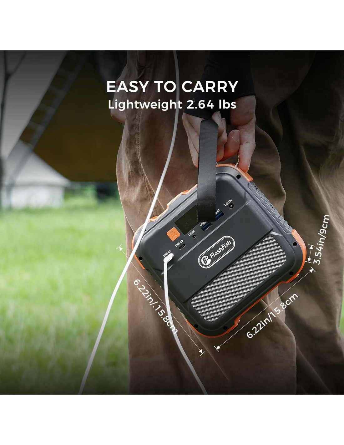 - [3 Formas de Recarga]: El paquete de baterías se puede recargar con el panel solar Flashfish de 50W/60W (SE VENDE POR SEPARADO), el enchufe de pared o el enchufe del automóvil. Tiempo de recarga: adaptador AC (incluido): 4 horas. Adaptador de automóvil de 12V (incluido): 4 horas. Panel solar Flashfish de 50W/60W (no incluido): 4-4.5 horas.