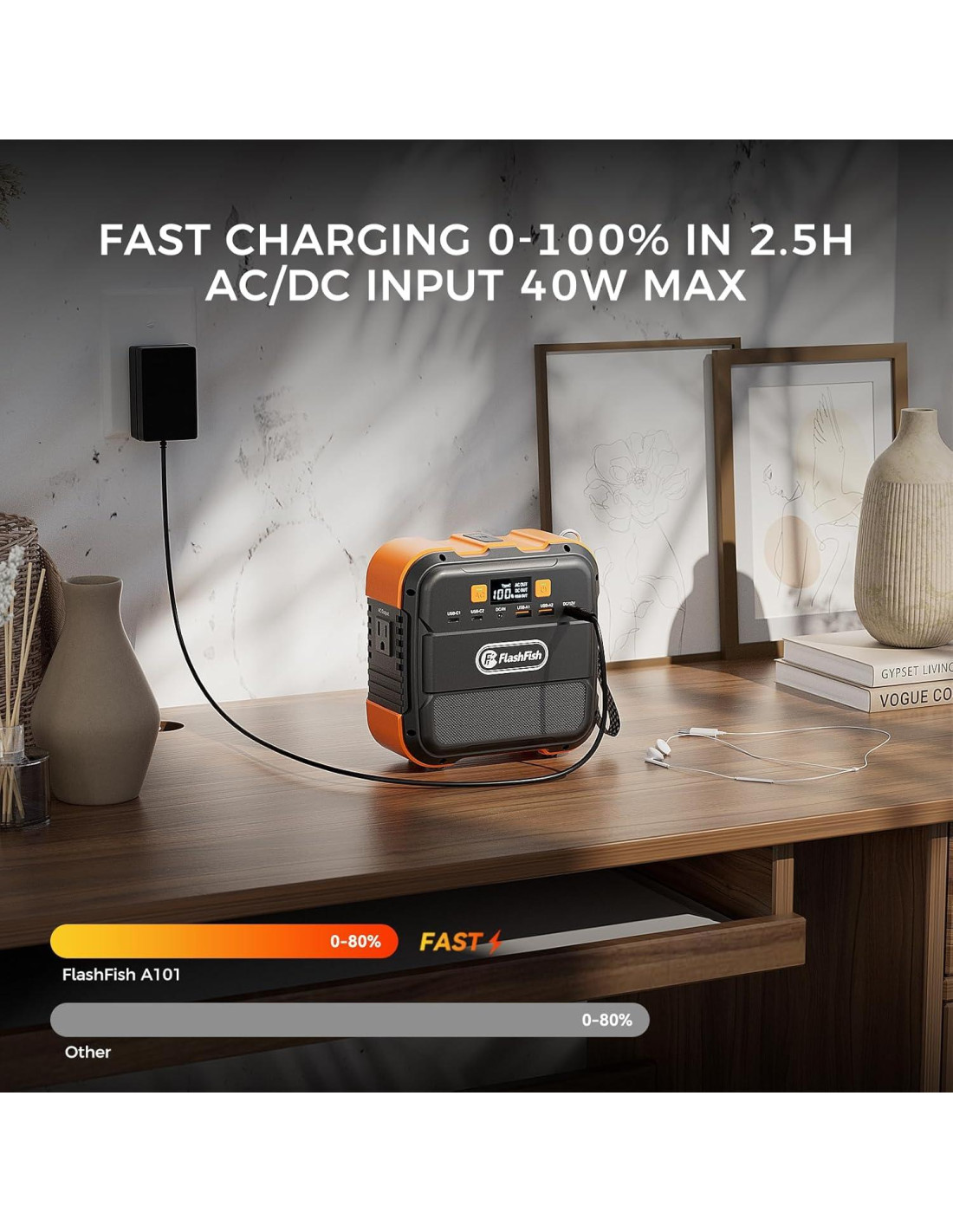 - [Múltiples Salidas]: El generador portátil Flashfish A101 cuenta con 1 puerto AC de 120W, 2 puertos Tipo-C de 18W, 2 puertos USB-A de 5V/2.4A y 1 salida DC de 12V/5A, soportando 6 salidas a la vez, carga para sus esenciales como teléfonos inteligentes, laptops, cámaras. La carga a través de los puertos DC y USB es compatible.