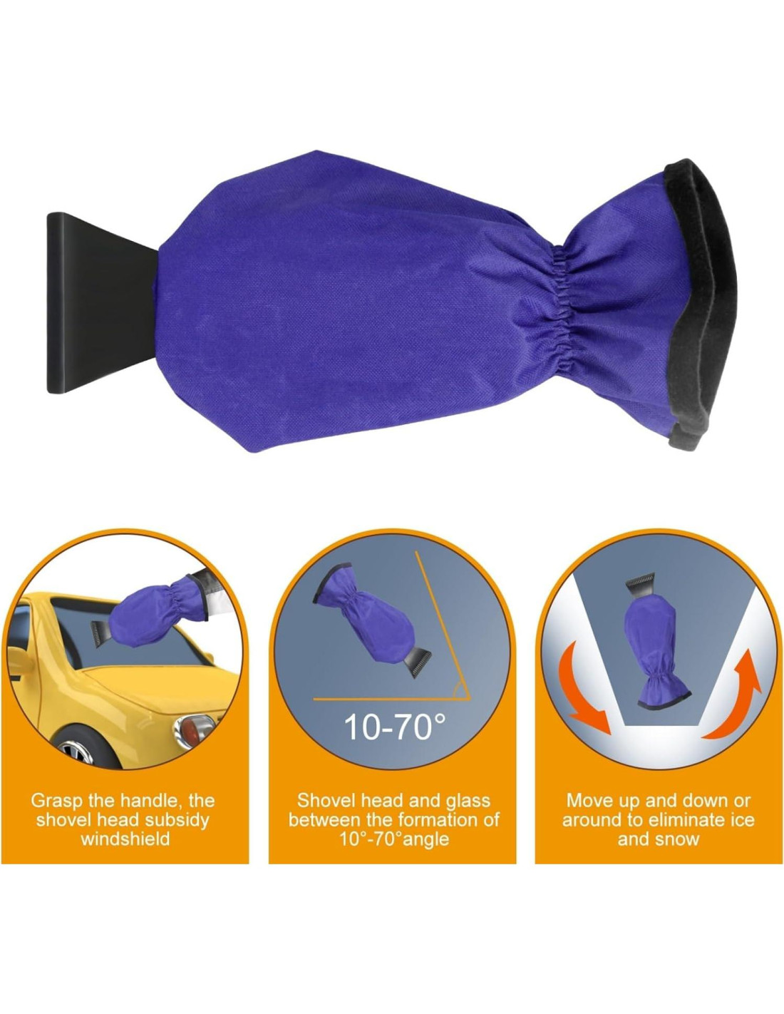 - Material: tela de poliéster 600D Ripstop (exterior del mitón) proporciona durabilidad y resistencia a desgarros, forro polar (interior del mitón) asegura calidez y comodidad, plástico ABS (raspador) es fuerte y afilado para una eficiente remoción de hielo y nieve