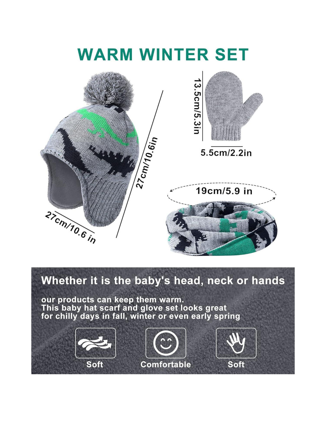- Conjunto encantador: el gorro de bebé, la bufanda cálida y el conjunto de guantes tienen un lindo patrón de dinosaurio, captarán la atención del bebé y lo harán lucir adorable con el gorro; La banda elástica alrededor de los guantes ayuda a que se ajusten y se mantengan en las manos de su hijo durante mucho tiempo, estos cómodos y de calidad gorros para clima frío harán que su hijo se destaque en la multitud