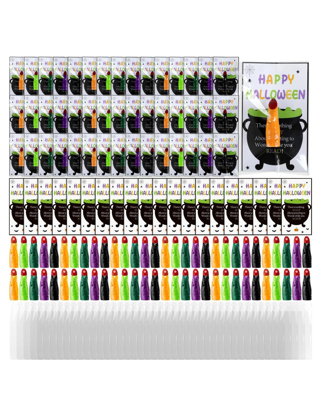 - Paquete de Regalo de Halloween de Valor: cada conjunto de regalos de Halloween al por mayor contiene 60 dedos de bruja (5 colores), 60 tarjetas de Halloween y 60 bolsas de regalo transparentes; Puedes empacarlos en bolsas de regalo transparentes para un regalo fácil; Este será un buen regalo para estudiantes en Halloween