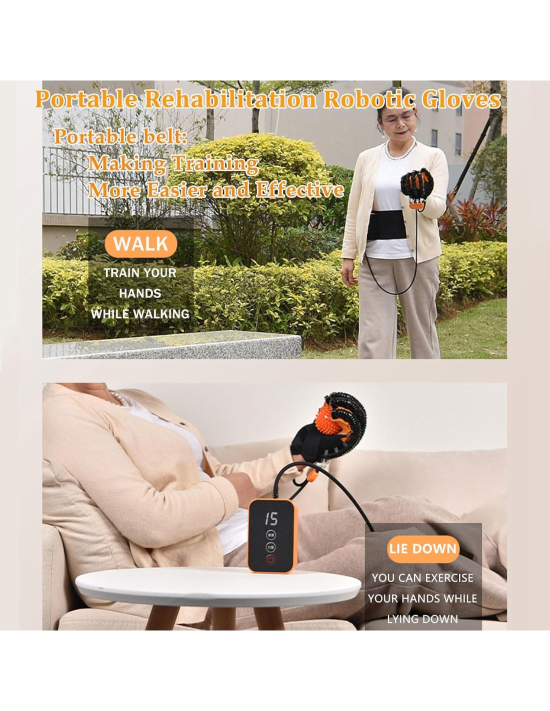 - Guante de Rehabilitación Portátil-Diseñado para la conveniencia, este guante de recuperación de mano es ligero y portátil, con un cinturón práctico para fácil transporte. Los pacientes pueden usarlo en cualquier lugar, respaldado por una batería recargable de 2400mAh incorporada.