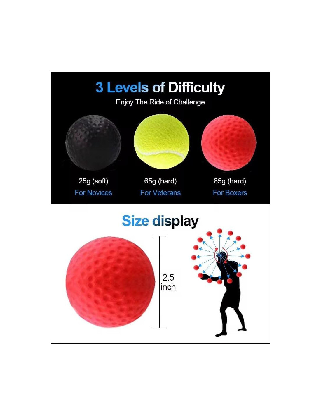 - SET COMPLETO: Incluye diadema ajustable y 3 bolas de reflejos en diferentes colores para niveles de dificultad variados - negro (principiante), amarillo (intermedio) y rojo (avanzado)