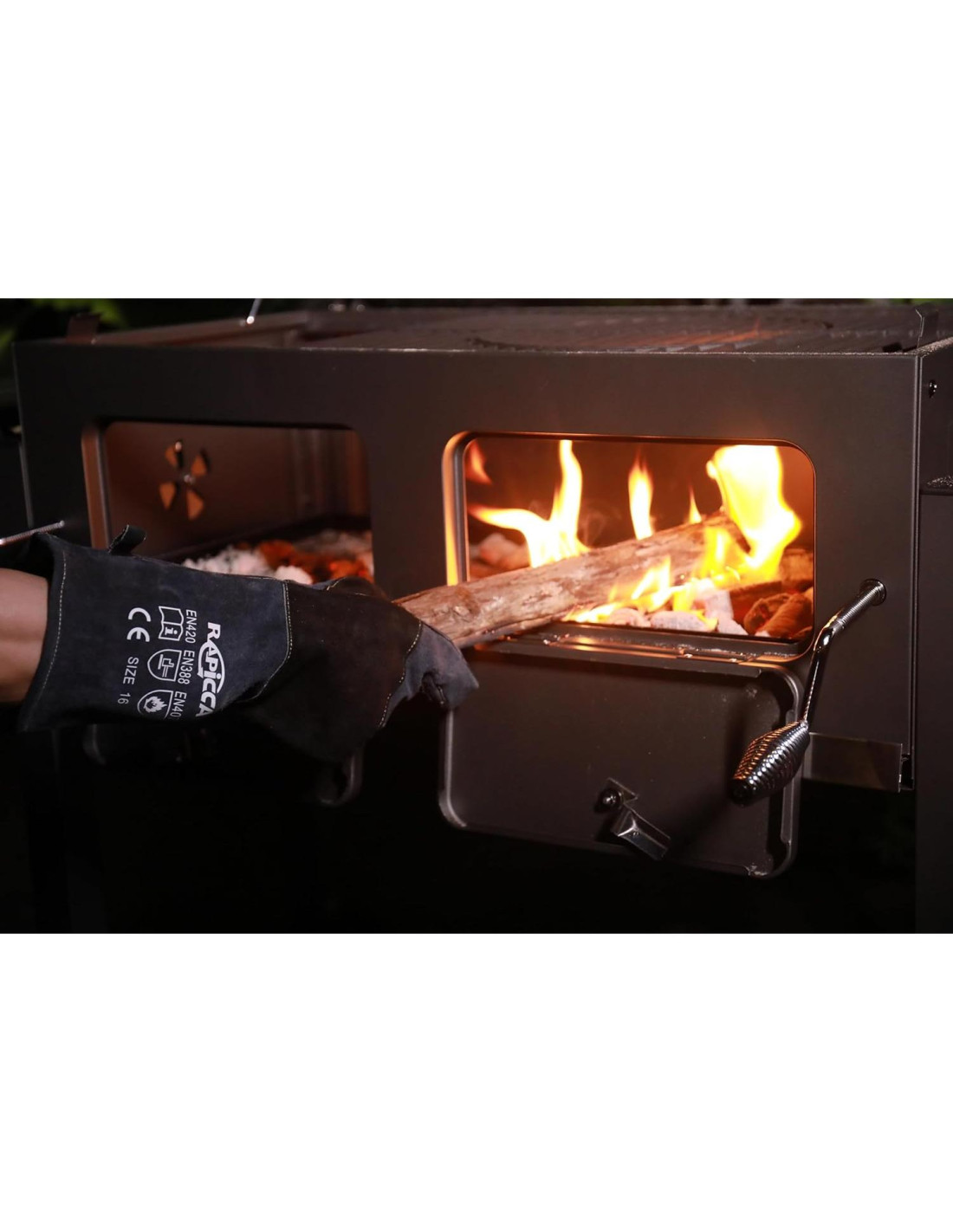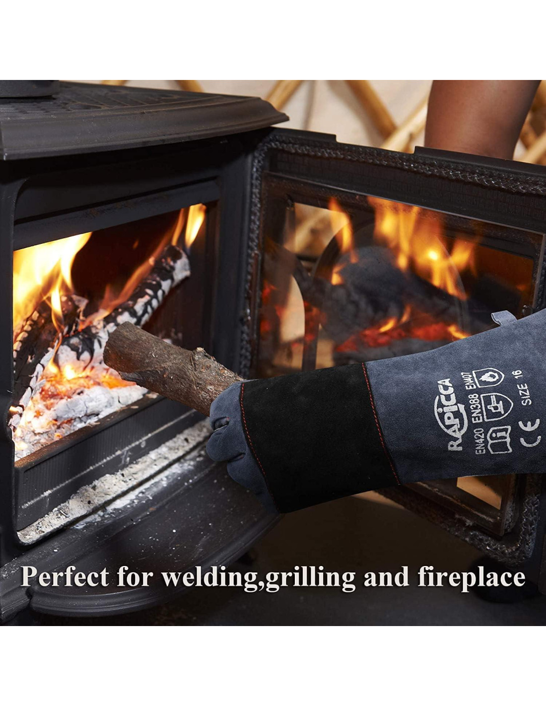 - GRAN RESISTENCIA AL FUEGO Y AL CALOR: Hecho de exterior de cuero a prueba de fuego premium, capa intermedia de papel de aluminio aislante, un forro de algodón suave y retardante de llama, y con acolchado doblemente reforzado de cuero en dedos, palmas, codos y dorso. Este excelente diseño hace que los guantes de chimenea RAPICCA sean resistentes al fuego y al calor hasta 932F(500C).