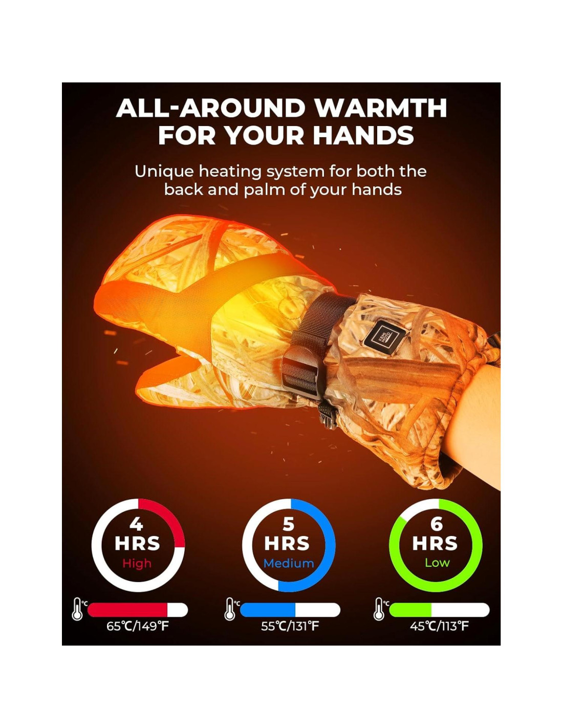 - Tres Configuraciones de Calor - Los guantes calentados KEMIMOTO cambian la luz roja para la configuración de calor más alta, alcanzando hasta 60C (140F) durante 4 horas. La luz azul para la configuración de calor media, alcanzando hasta 50C (122F) durante 5 horas. La luz verde para la configuración de temperatura más baja, alcanzando hasta 40C (104F) durante 6 horas. Simplemente presiona el interruptor durante 3 segundos para encenderlo o apagarlo. Un toque rápido apagará la luz, evitando cualquier perturbación a la caza durante la caza.