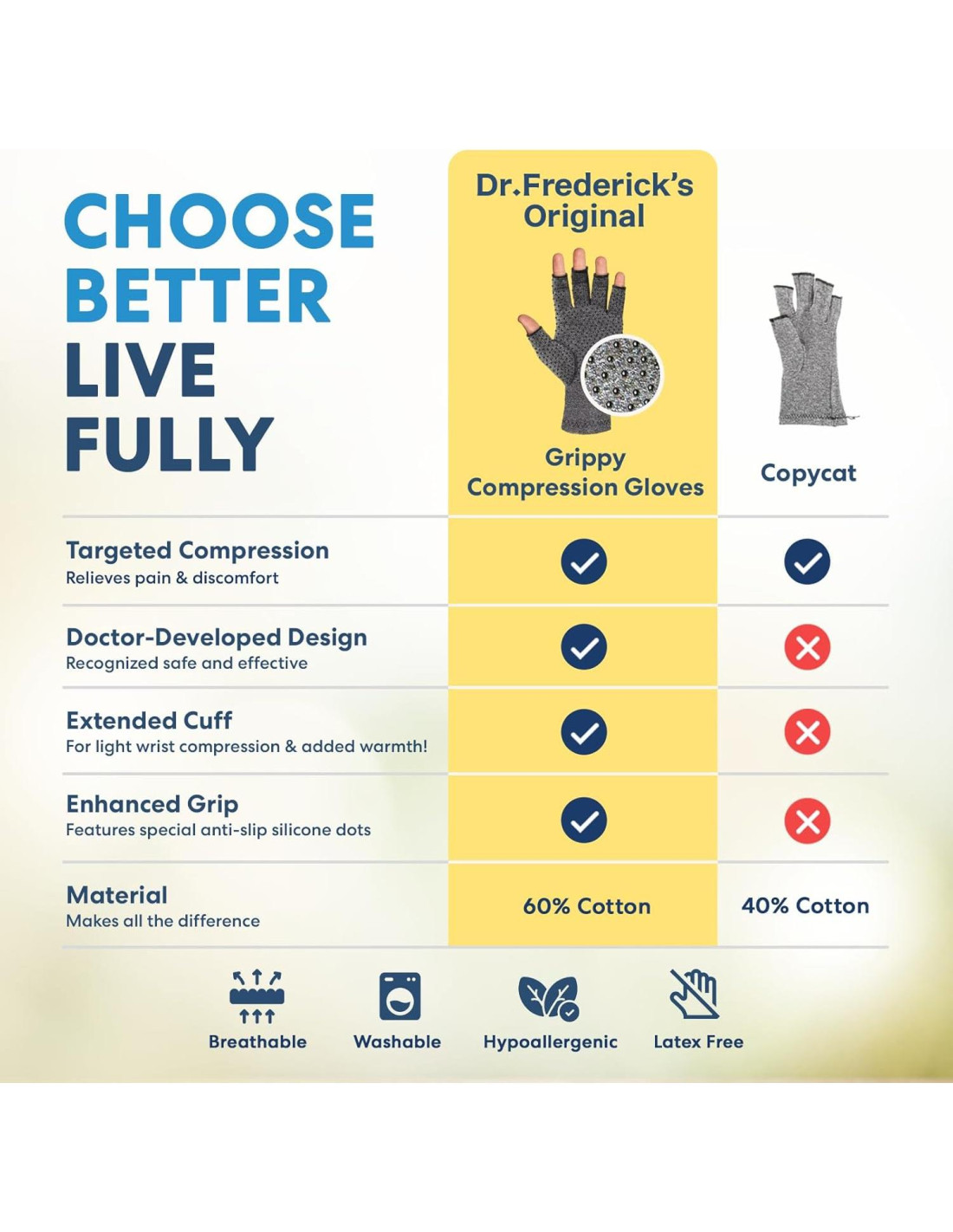- Un Compromiso con Tu Satisfacción: Dr. Frederick's Original está dedicado a tu satisfacción. Nuestros productos, incluidos estos guantes para artritis, son parte de nuestro compromiso con tu comodidad. Si encuentras que no cumplen con tus expectativas, háznoslo saber. Estamos aquí para apoyarte en encontrar la solución adecuada para tus necesidades de comodidad.