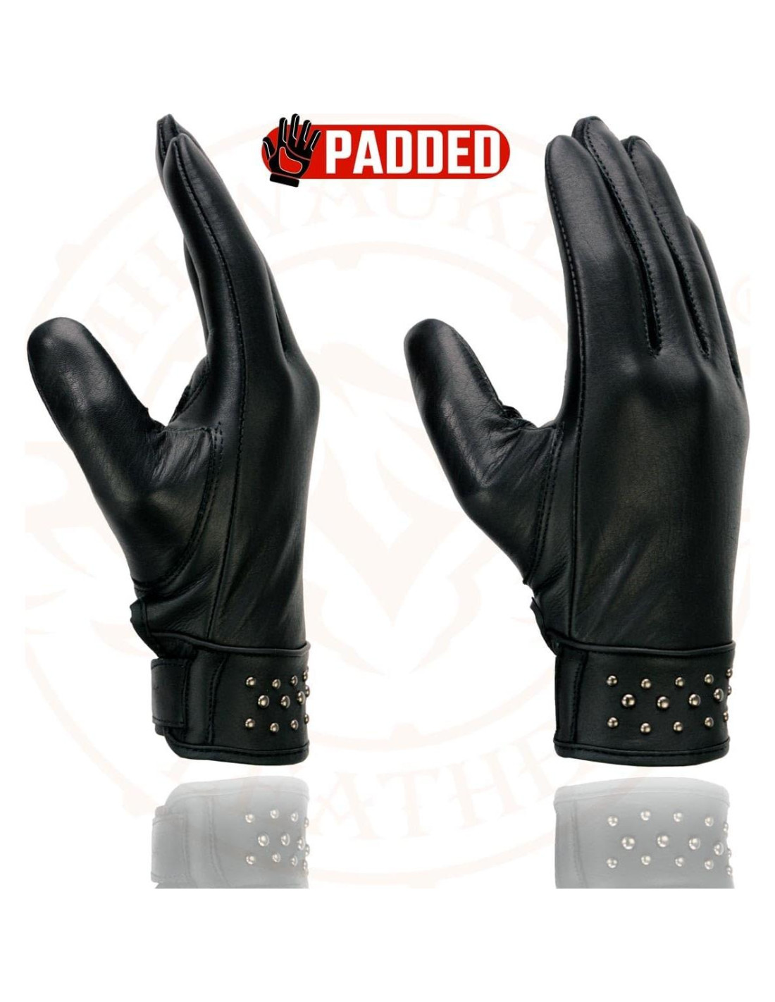 Guantes de cuero negro para mujer Milwaukee Leather MG7760 con palmas de gel hechos de cuero de vaca premium con detalles de remaches que delinean la muñeca. Forro ligero con palma de gel. Correa ajustable en la muñeca.