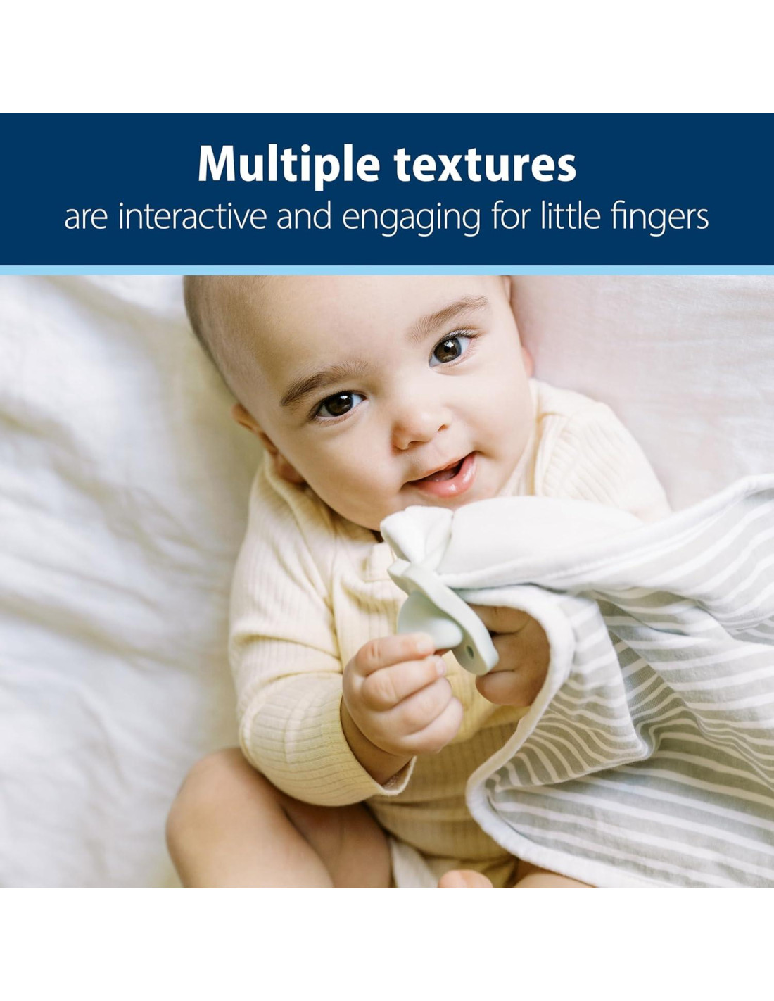 Ayuda al bebé a calmarse por sí mismo y a mantener su chupete o mordedor cerca con la Manta Lovey de Dr. Brown. La manta de seguridad cuenta con un cierre a presión para mantener un chupete o mordedor asegurado y fácilmente accesible. El set de Manta Lovey incluye el Chupete de Silicona HappyPaci de Dr. Brown (0-6m), un chupete ligero de silicona 100% con forma de pezón de biberón de Dr. Brown y un Anillo de Mordedor con Perlas Flexees de Silicona 100% (3m+) para masajear y calmar las encías adoloridas. La Manta Lovey de Dr. Brown es de doble cara y presenta algodón suave en un lado y un tejido suave y acogedor en el otro para mantener al bebé cómodo mientras explora nuevas texturas y practica habilidades motoras. La Manta Lovey es lavable a máquina y el HappyPaci y el anillo de mordedor con perlas Flexees son seguros para lavavajillas (rejilla superior) y esterilizadores. La manta para bebé se despliega a 30.48 x 30.48 centímetros.