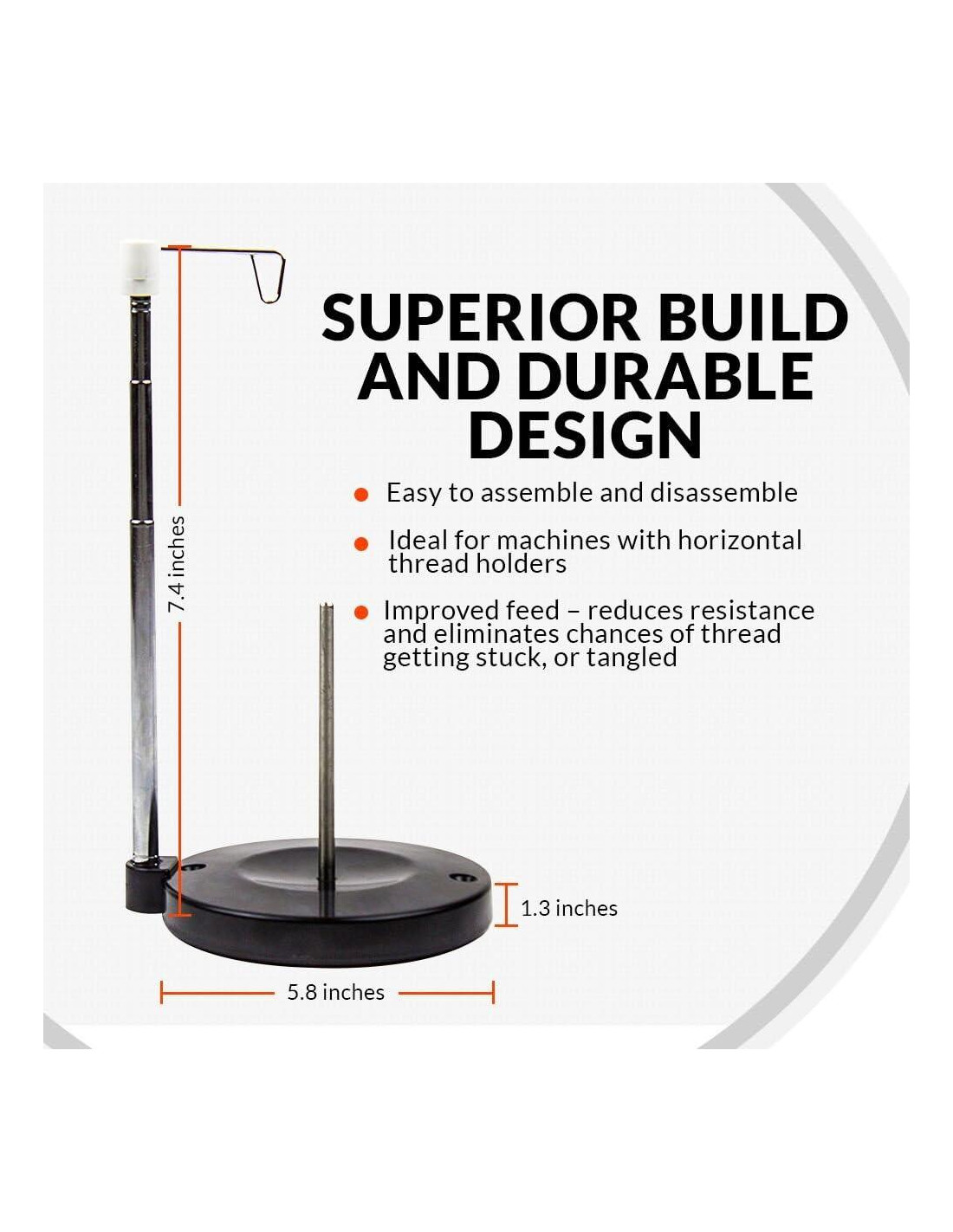 - DISEÑO INTELIGENTE - Hay un pin central para sostener la bobina que es capaz de sostener tamaños de bobinas muy grandes también. El hilo de la bobina se enhebra a través del gancho al final de la guía vertical alta y luego se puede enhebrar normalmente a través de la máquina como de costumbre. La barra de guía alta asegura que el hilo se suministre desde un punto que está más alto que tu máquina para hacer que el suministro sea ultra-suave.