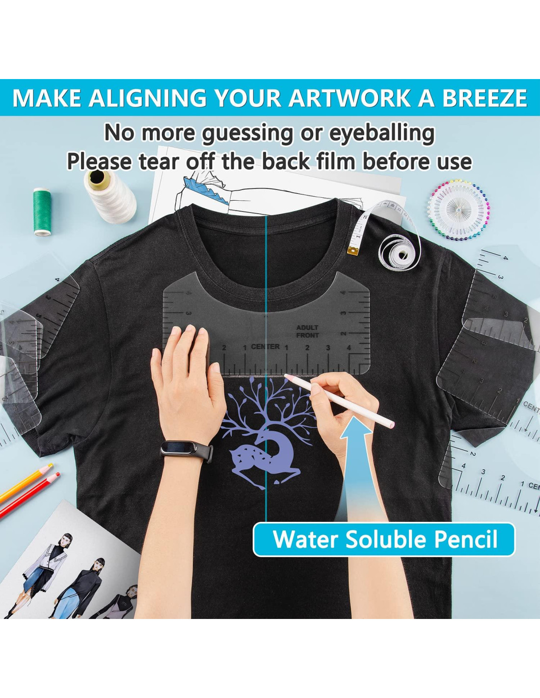 - [Herramienta de Alineación de Camisetas 13pcs] Contiene 8 reglas de camiseta transparentes, 1 cinta métrica, 3 lápices de marcado solubles en agua (blanco, amarillo, rojo), 1 set de alfileres de perla (40pcs) para fijar. Te ayuda a hacer alineaciones y ahorrar tiempo en centrar tus diseños.