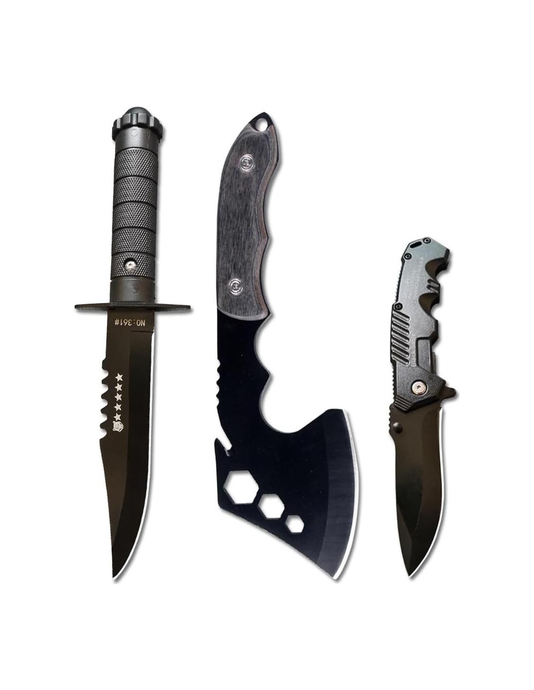 - El paquete incluye y tamaño: cuchillo de caza de hoja fija * 1: 28.4 cm x 3 cm + Hacha * 1: 25.9 cm x 8.5 cm + cuchillo plegable * 1: 20 cm x 3 cm