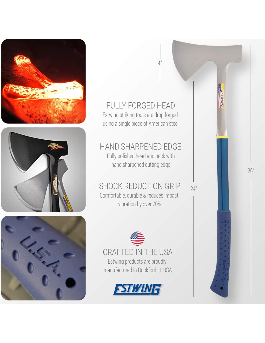 Del Fabricante Para talar, podar árboles y/o dividir madera, hacer muescas en vigas, clavar estacas de madera o plástico. Construcción de acero sólido forjado en una sola pieza para eliminar cabezas sueltas. Agarre de nylon vinílico con cojín profundo unido al mango de acero para comodidad y durabilidad. Desde 1923, la familia Estwing y sus empleados se han enorgullecido de diseñar y fabricar las herramientas de golpeo y golpeadas más duraderas, cómodas y atractivas del mundo. Todos los martillos de garra, hachas, herramientas especiales y palancas se fabrican con los más altos estándares posibles y ofrecen un verdadero valor tanto a los trabajadores como a los artesanos.