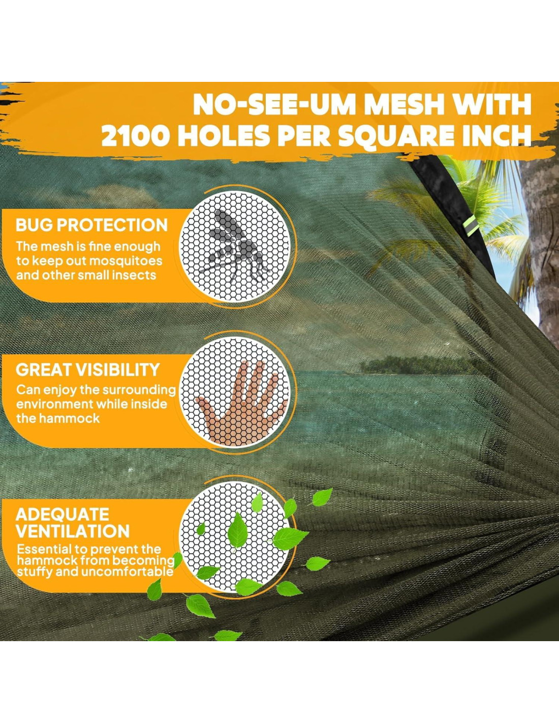 - RED - También está equipada con una red que evitará que cualquier cosa perturbe tu descanso. Cremallera de doble sentido de alta calidad, ábrela desde adentro o afuera. La red contiene 2,100 agujeros por pulgada cuadrada, por lo que puedes descansar tranquilo sabiendo que la hamaca de red te protegerá al aire libre. Si deseas tener una vista más amplia, simplemente puedes voltear la hamaca de red y usarla como una hamaca regular.