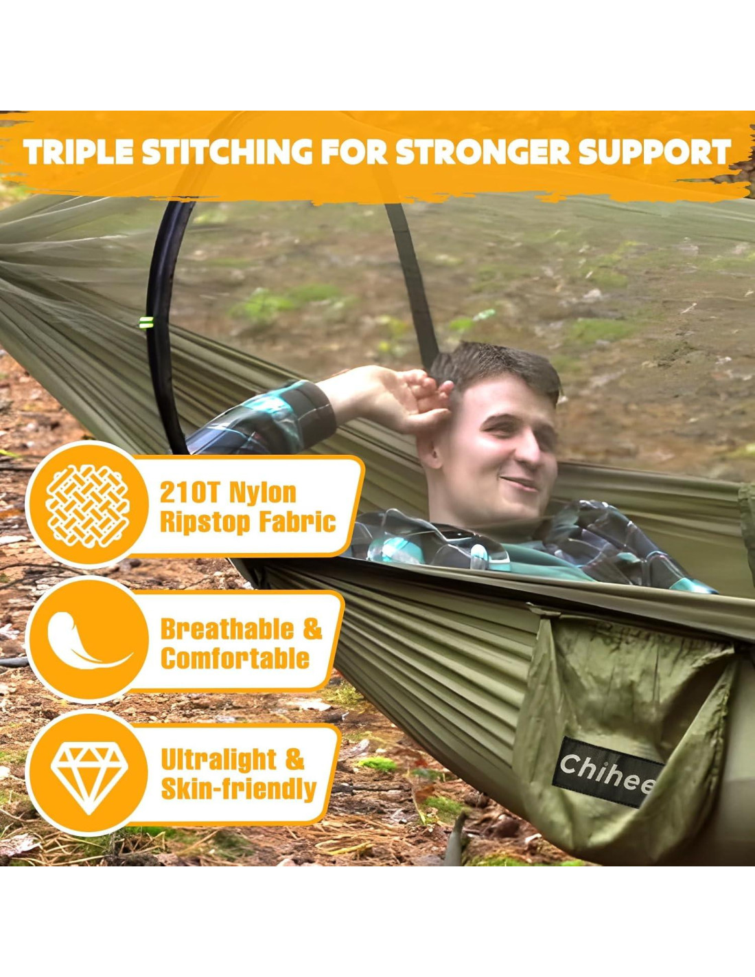 - FUERTE PARA VIAJES FÁCILES, CAMPING Y MONTAJE - Simplemente guarda la hamaca en el pequeño saco adjunto, ponlo en tu mochila y ¡listo! Cuando encuentres el mejor lugar para acampar, el montaje es muy fácil con los carabineros de acero incluidos y las correas amigables con los árboles. Incluso puedes colgar tu hamaca entre 2 árboles a más de 19.7ft (6.0 m) de distancia gracias a las dos correas de 9.2ft (2.8 m). Nunca necesitarás atar las cuerdas para la red de mosquitos. En el momento en que saques la hamaca de la bolsa, la red se levantará automáticamente.