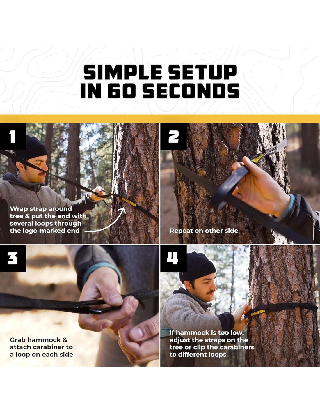- Instalación Rápida y Sencilla: Las correas anchas para árboles, los mosquetones y las cuerdas de sujeción ajustables permiten una instalación rápida sin herramientas. Crea un espacio seco y relajante en cualquier lugar que explores.