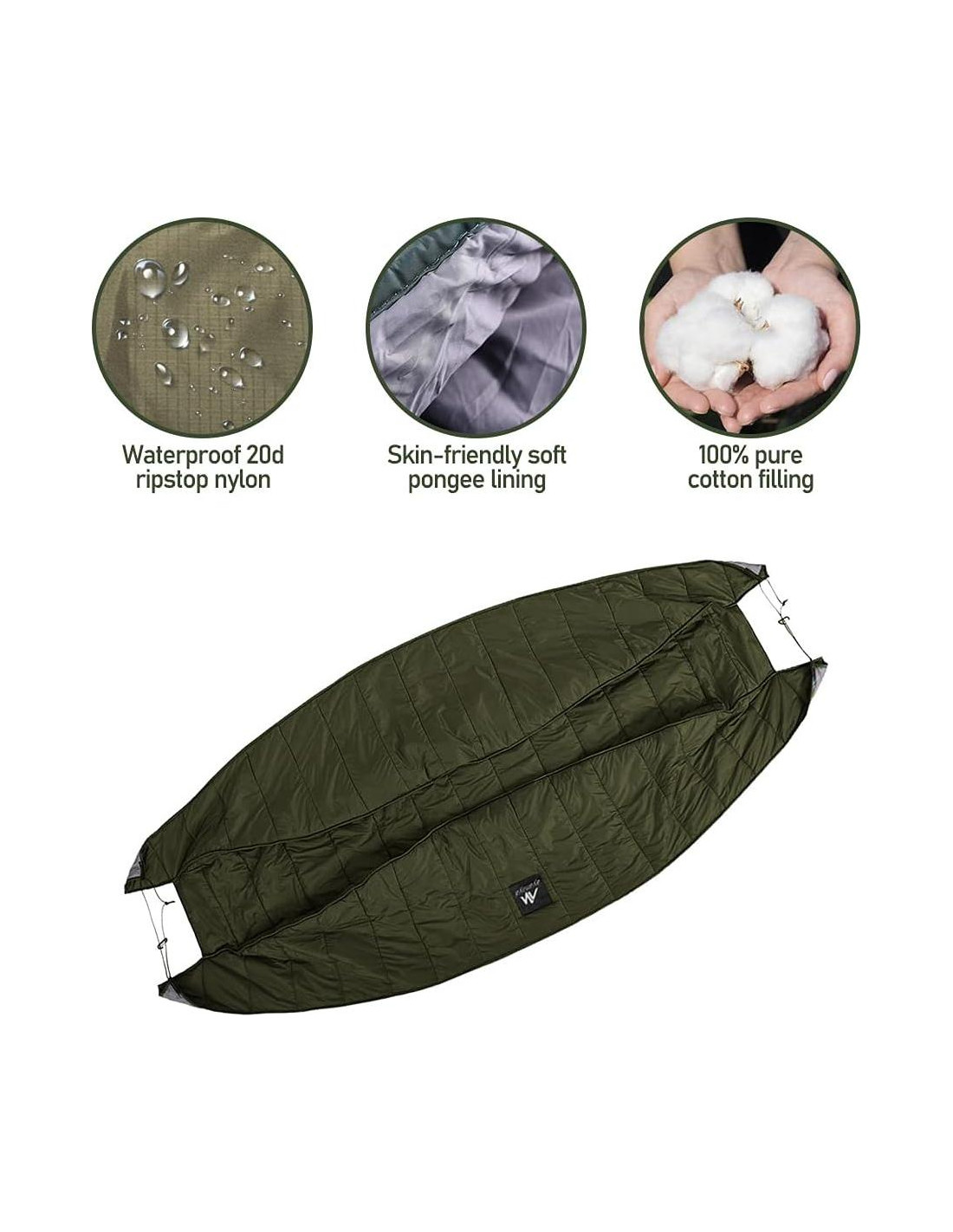 - [Colchoneta Inferior Doble] Material Bien Hecho: La superficie de la colchoneta inferior para hamaca está hecha de nylon ripstop de alta densidad 20D, costuras reforzadas, lo suficientemente resistente y resistente al agua; el forro es de poliéster pongee ultrasuave y amigable con la piel 240t, con relleno de algodón de poliéster de 300g, te hará sentir muy cómodo y cálido al dormir.
