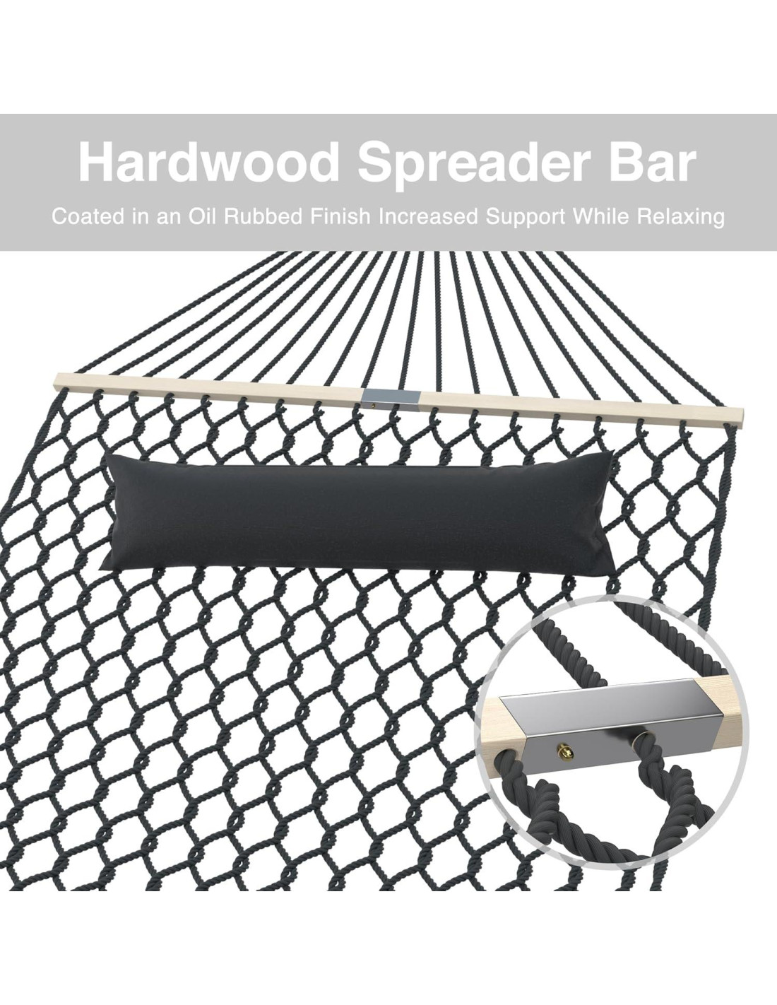 - Tamaño extra grande y buena capacidad: dimensiones generales: 126 pulgadas (320.04 cm) (L) x 60 pulgadas (152.4 cm) (W). Tamaño de cama de hamaca más grande de 79 pulgadas (200.66 cm) de largo x 60 pulgadas (152.4 cm) de ancho. Tamaño de almohada de hamaca: 40 pulgadas (101.6 cm) (L) x 8 pulgadas (20.32 cm) (W). Esta hamaca de alta resistencia está hecha para compartir. Diseñada para soportar hasta 470 libras (213.36 kg), puedes disfrutar de un relajante balanceo en la hamaca con familiares, amigos y seres queridos