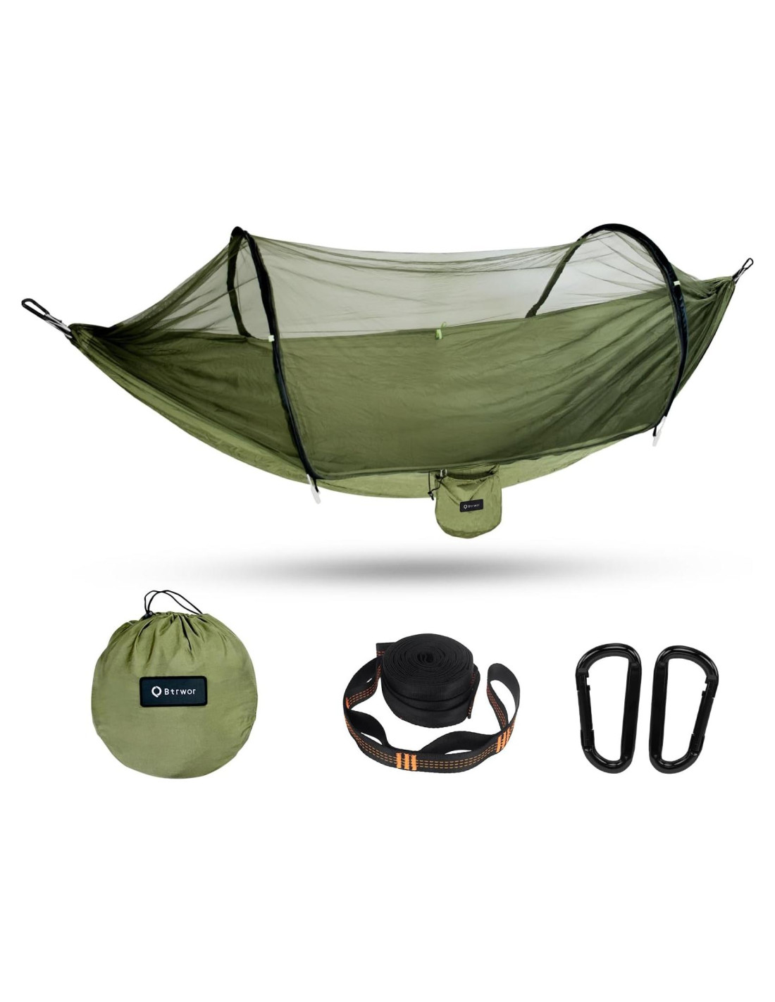 ¿Has tenido una experiencia con hamacas de camping portátiles que en realidad no son muy portátiles? ¿Has intentado montar la hamaca solo para descubrir que las correas no estaban incluidas o que las cuerdas ya estaban desgastadas? ¡Entonces es hora de retirar tu vieja hamaca desgastada y comenzar a acampar de la nueva manera! Hamacas de alta calidad, duraderas, cómodas y fáciles de usar. Cuando se trata de amar esa vida de hamaca, ¡tiene que ser Btrwor! Más que una hamaca, proporcionando seguridad y comodidad. Ya sea que estés listo para un buen rato mientras acampas al aire libre con amigos o una tranquila noche bajo las estrellas en tu patio trasero, nuestra hamaca de paracaídas puede ir a donde tú vayas. La hamaca es muy portátil y se puede guardar en tu mochila. Ganchos de carabineros diseñados especialmente aseguran una colgada segura y más fácil. Las redes antimosquitos pueden prevenir que los insectos entren y permitir que el aire circule al mismo tiempo. Encuentra dos árboles o puntos de anclaje a unos 3-4.5 metros de distancia para asegurar que la hamaca y la persona en la hamaca puedan sostenerse de manera segura. Toma la hamaca y conecta los carabineros a los lazos en ambos lados. Si la hamaca está demasiado baja, ajusta las correas del árbol o conecta el carabinero a otro lazo. hamaca (oliva) hamaca (negro carbón) Conjunto de hamaca más red antimosquitos Solo red antimosquitos