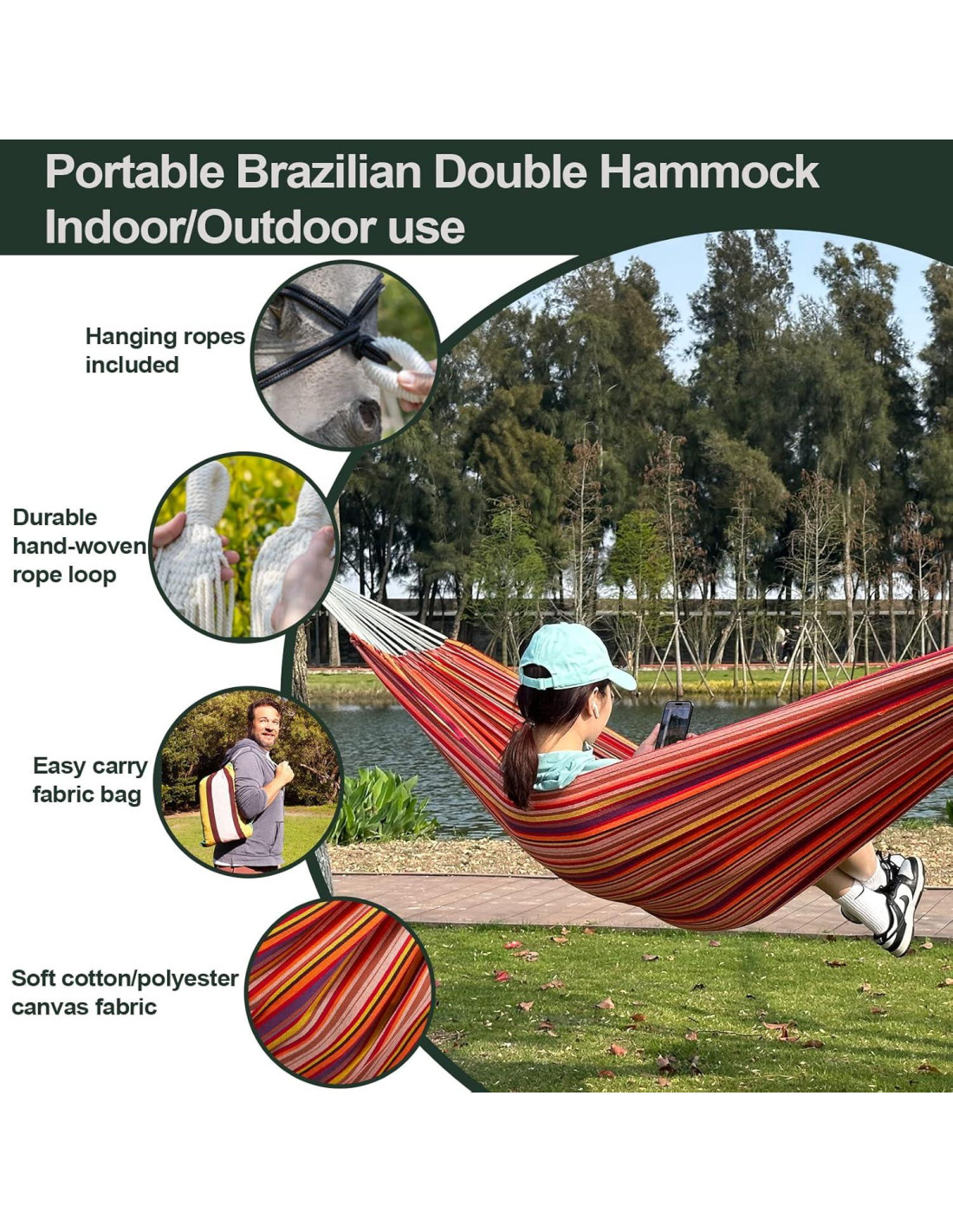 - Tela Cómoda: Esta hamaca brasileña está hecha de tela de lona de algodón/poliéster densa y amigable con la piel, que es cómoda, transpirable y resistente, además de duradera.