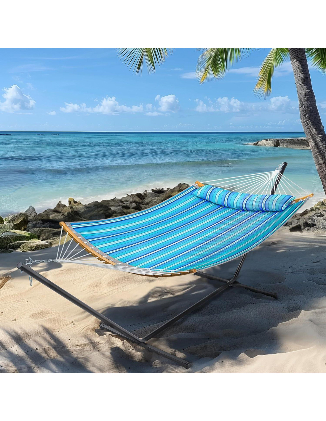 - [Larga Duración]: Con una barra de extensión soportada por cuerdas resistentes, esta hamaca doble es lo suficientemente fuerte como para soportar 215.5 kg (475 lbs). Soporte independiente resistente con recubrimiento anti-óxido es resistente a la intemperie, lo que la hace ideal para uso al aire libre.