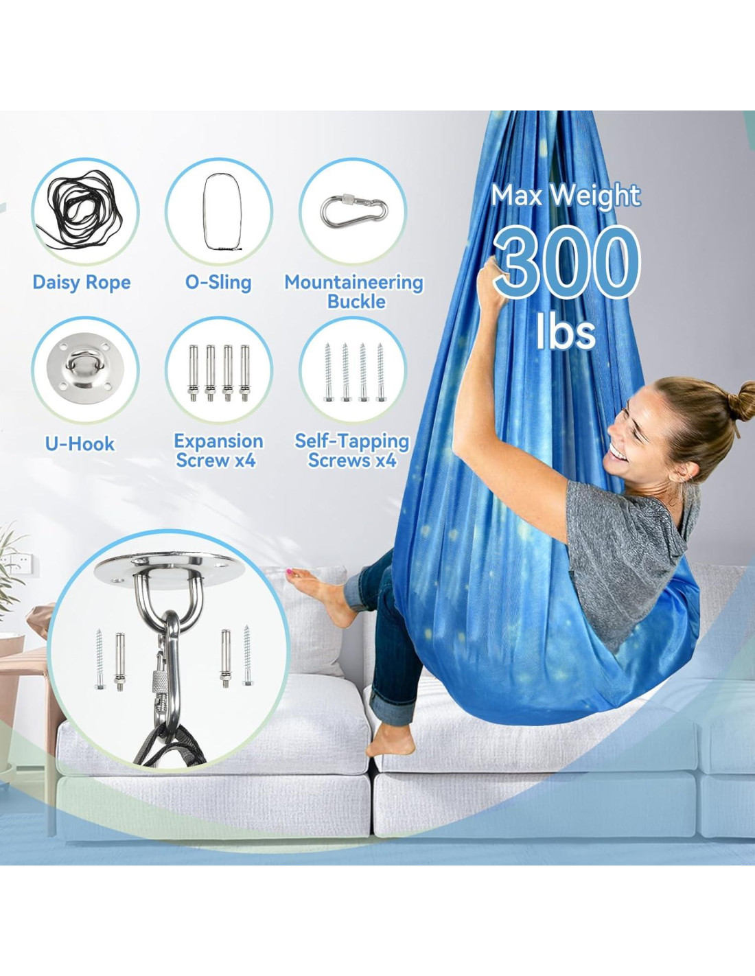 - Material de Tela de Poliéster de Alta Calidad: Nuestro columpio colgante sensorial combina elasticidad y suavidad, que es duradero, no se deforma, antideslizante y lavable a máquina, tela azul profunda adornada con impresión de alta definición de un cielo estrellado, el columpio de habitación es fácil de crear un ambiente calmante con una experiencia sensorial inmersiva.