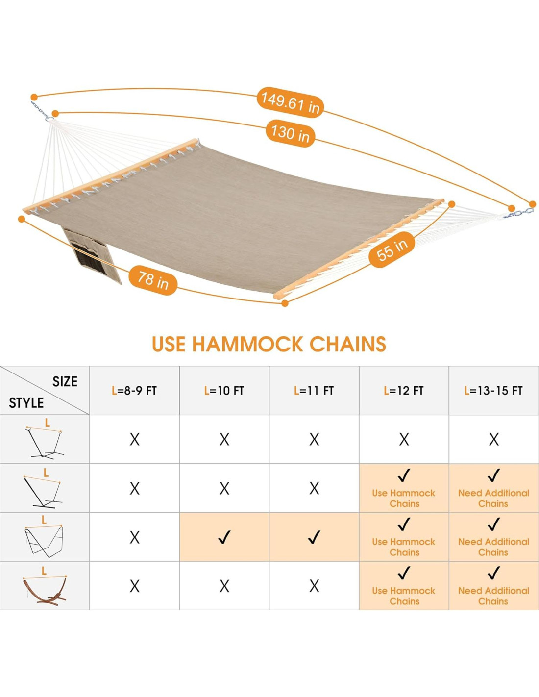 - HAMACA PARA 2 PERSONAS: La hamaca Lazy Daze es lo suficientemente grande para acomodar a 2 personas. El tamaño de la cama de la hamaca es de 200 cm x 140 cm. La longitud de anillo a anillo es de 330 cm. Con la adición de dos cadenas de acero de 25 cm, la longitud total de la hamaca es de 3.81 metros.