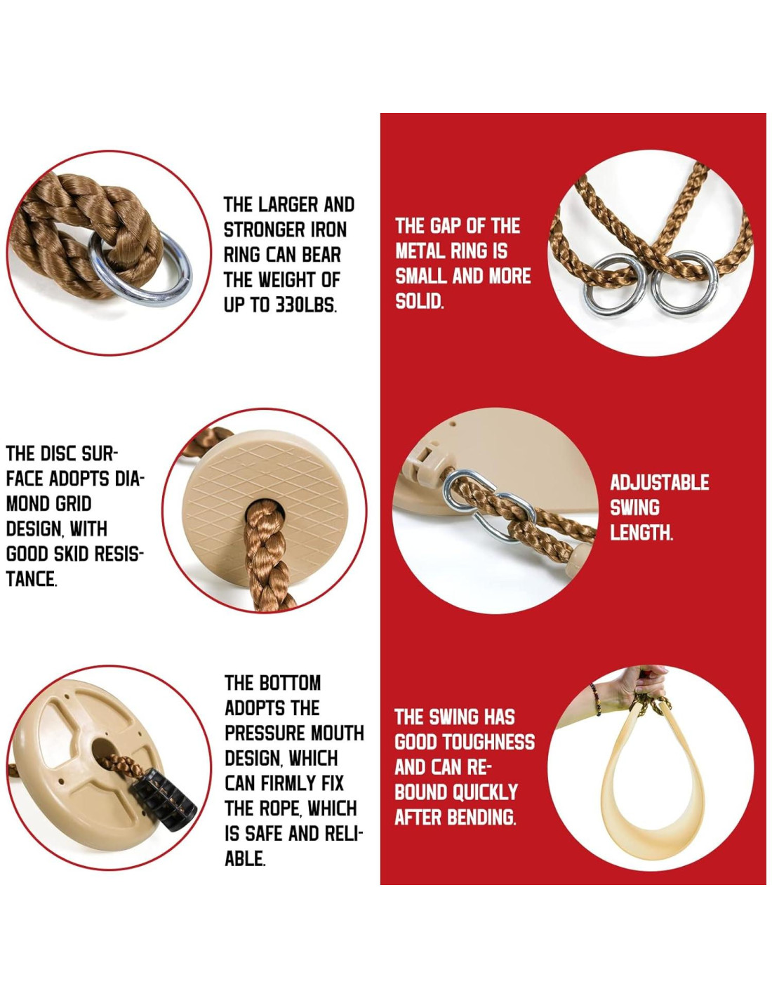 - [Altura de instalación ajustable] La longitud del columpio de disco es de 2.01 m (6.6 pies). Si la longitud es demasiado corta, puedes usarla con la correa de árbol de 1.22 m (4 pies) adjunta. La longitud de la cuerda del columpio suave se puede ajustar a voluntad, según tus propias necesidades, también se puede usar con correas para árboles.