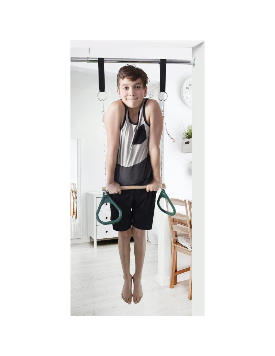 - Incluye combo de barra de trapecio y anillos de gimnasia rojos.