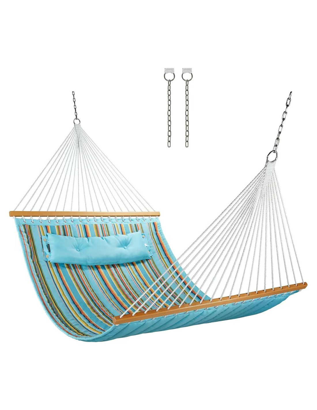 - Hamaca acolchada: Tela de poliéster acolchada de doble capa con relleno de fibra de poliéster y almohada de cabeza rellena de polietileno proporciona comodidad superior. La barra de extensión de madera dura de 139.7 cm está acabada con aceite para resistencia a la intemperie y estabilidad. Los extremos de las cuerdas de poliéster son tejidos por los artesanos de hamacas para un uso confiable, y el grosor de las cuerdas finales contribuye al equilibrio y la resistencia de la hamaca.