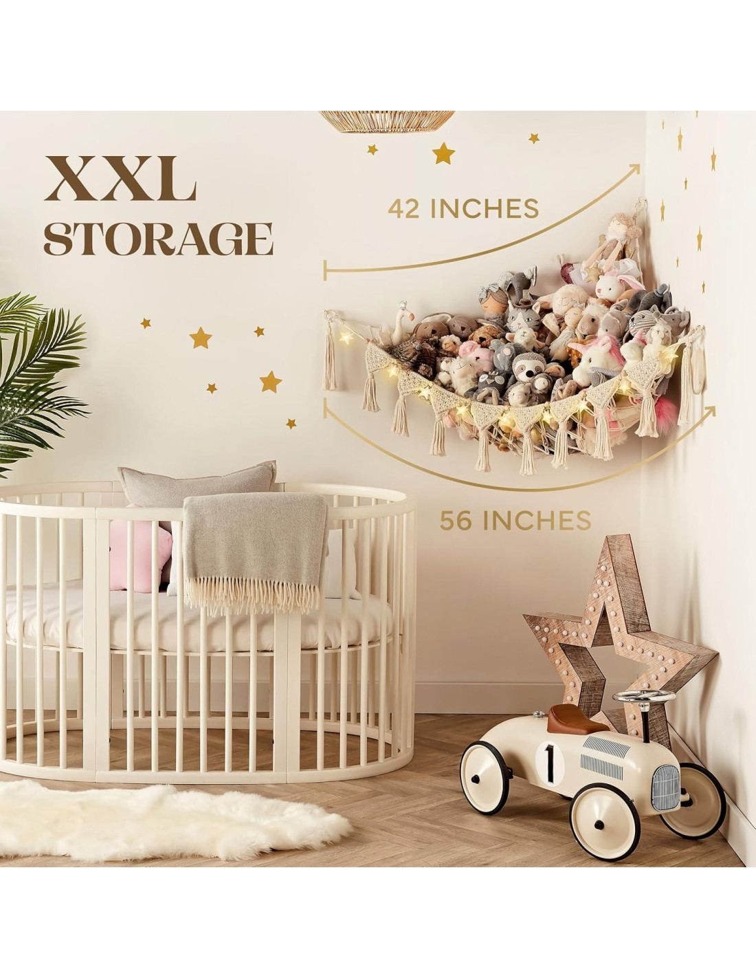 - [Decoración Mágica y Caprichosa.] Un organizador de peluches con borlas inspiradas en Boho y cuentas de madera, en 1 de 4 colores increíbles. Las luces LED ambientales en forma de estrella y los adhesivos de pared añaden un brillo acogedor y soñador, haciendo que sea más que solo un soporte de peluches