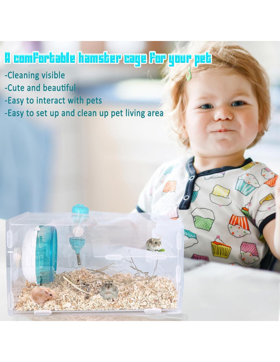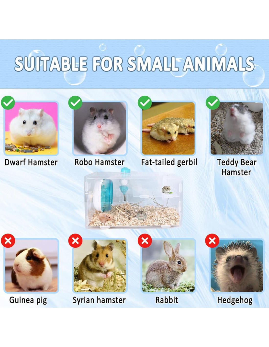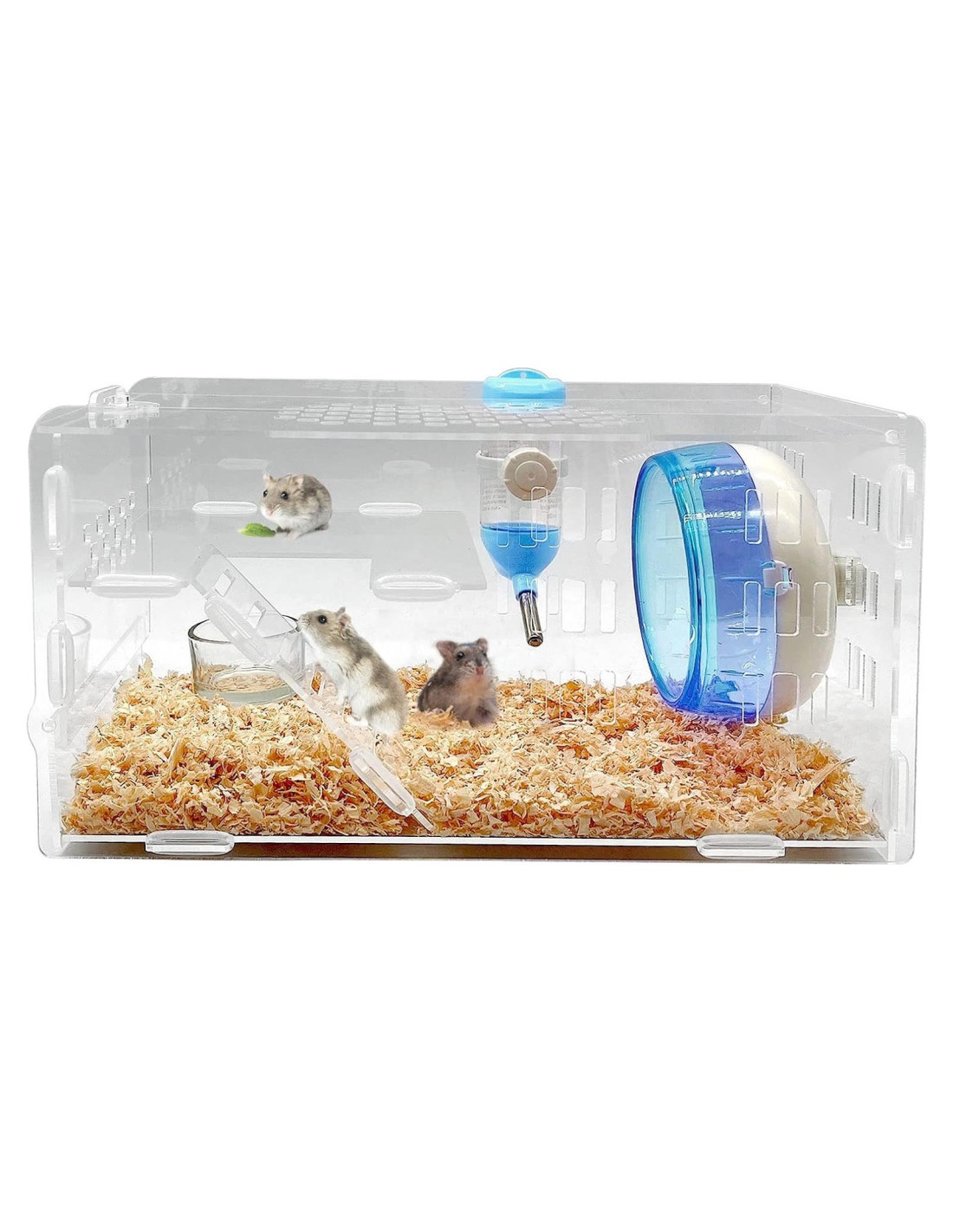 - ACCESORIOS PARA HÁMSTERS Además de una jaula vacía, nuestra jaula para hámsters enanos está equipada con una rueda de ejercicio de 4.7 pulgadas (12 cm), una botella de agua y un tazón de comida transparente para satisfacer la rutina diaria de la vida del hámster.