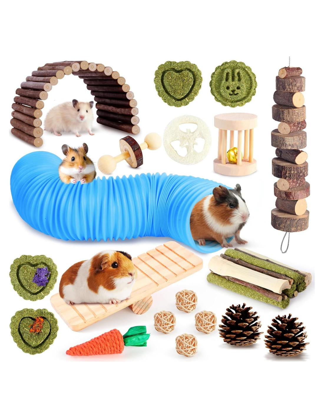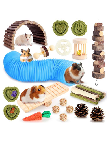 - [Aventuras de Juego Sin Fin] ¡Mantén las patitas pequeñas ocupadas con más de 24 juguetes interactivos! Desde un túnel estirable de 20 pulgadas (50.8 cm) para jugar al escondite hasta un rodillo de campana y un balancín, este conjunto transforma las jaulas en parques de juegos. Incluye piñas masticables, dulces palos de bambú y pasteles de heno en forma de corazón para satisfacer los instintos naturales de roer.