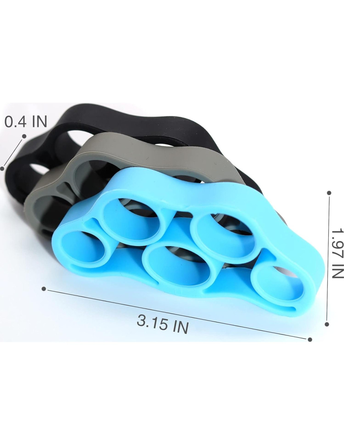 Especificaciones: Material: Silicona Tamaño: 8x3.5x1.3cm (3''x1.4''x0.5'') Color: Gris, Azul, Negro Paquete Incluye: 3 x Fortalecedor de Dedos de Silicona Características: 3 Niveles: -Nivel 1 - Azul Claro: Resiliencia más pequeña, adecuado para relajación y rehabilitación. -Nivel 2 - Negro: Elasticidad moderada, adecuado para practicar resistencia. -Nivel 3 - Gris: Mayor capacidad de estiramiento, excelente para fortalecer los músculos de los dedos. Cómo Usar el Ejercitador de Dedos: 1. Coloca los lazos sobre cada dedo, junta tus dedos y luego estira a una velocidad constante lentamente. 2. Cuando llegues al punto extremo, mantén durante 3 segundos. 3. Luego relájalos lentamente y repite 30 veces.