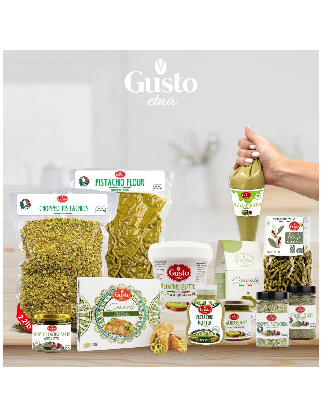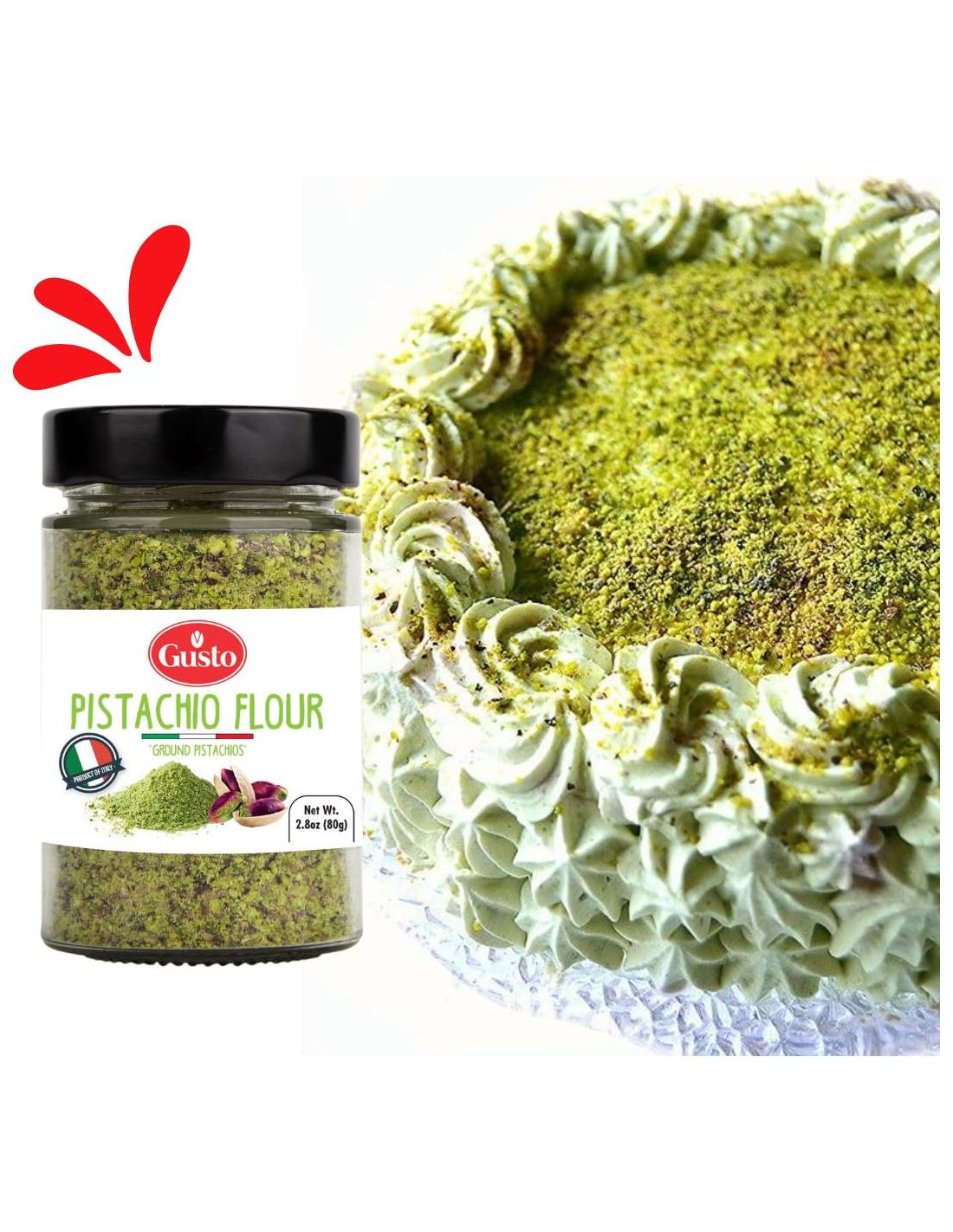 - Harina de Pistacho Premium: Disfruta del rico sabor de la harina de pistacho fina de Gusto ETNA, hecha de pistachos molidos provenientes de Italia.