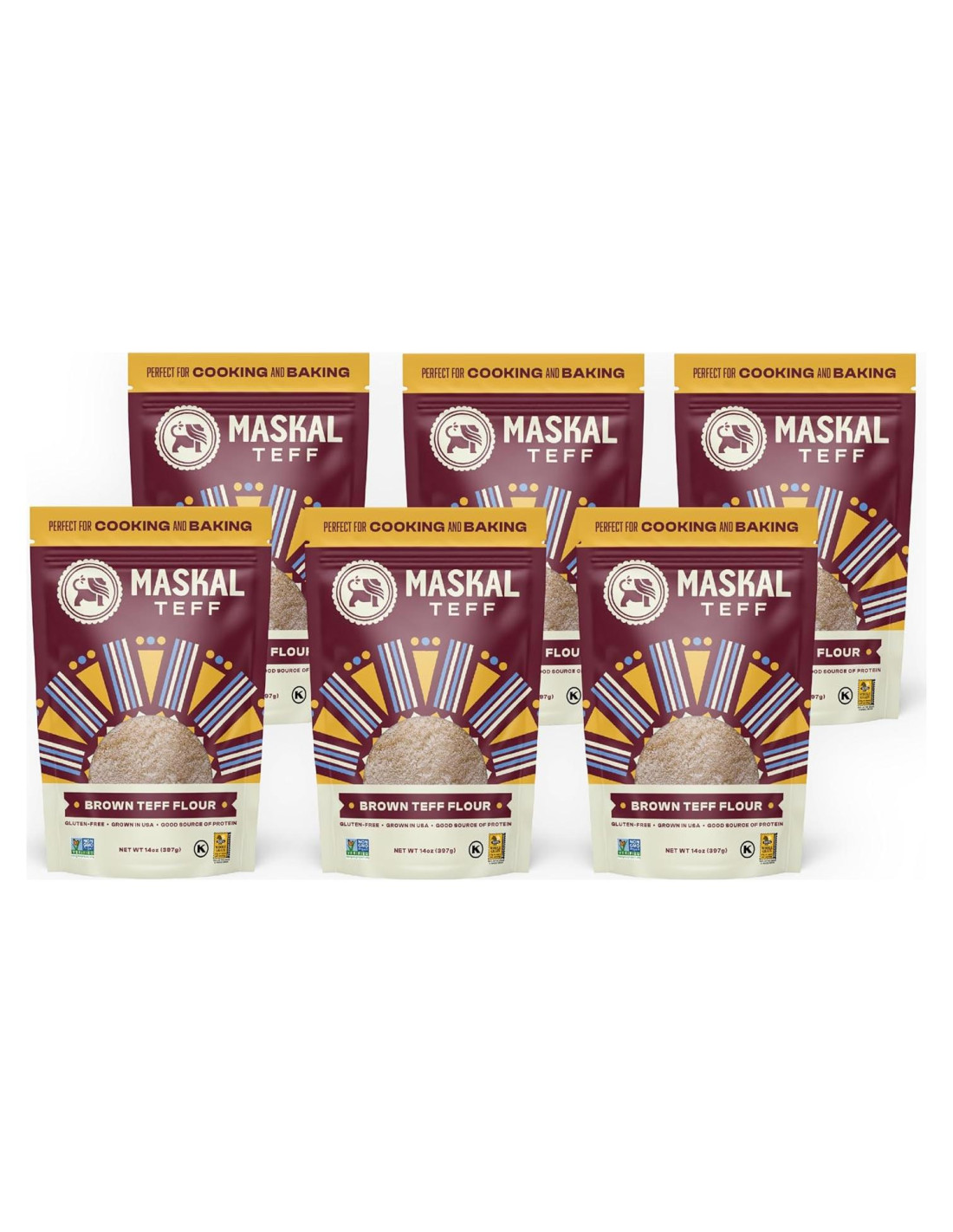 Harina de Teff Marrón Maskal - Paquete de Valor al por Mayor de 6 Paquetes. Abastece con este paquete de 6 de Harina de Teff Marrón Maskal, una harina integral rica en nutrientes y sin gluten con un profundo sabor a nuez. Perfecta para injera, panqueques, pan sin gluten y para espesar sopas.
