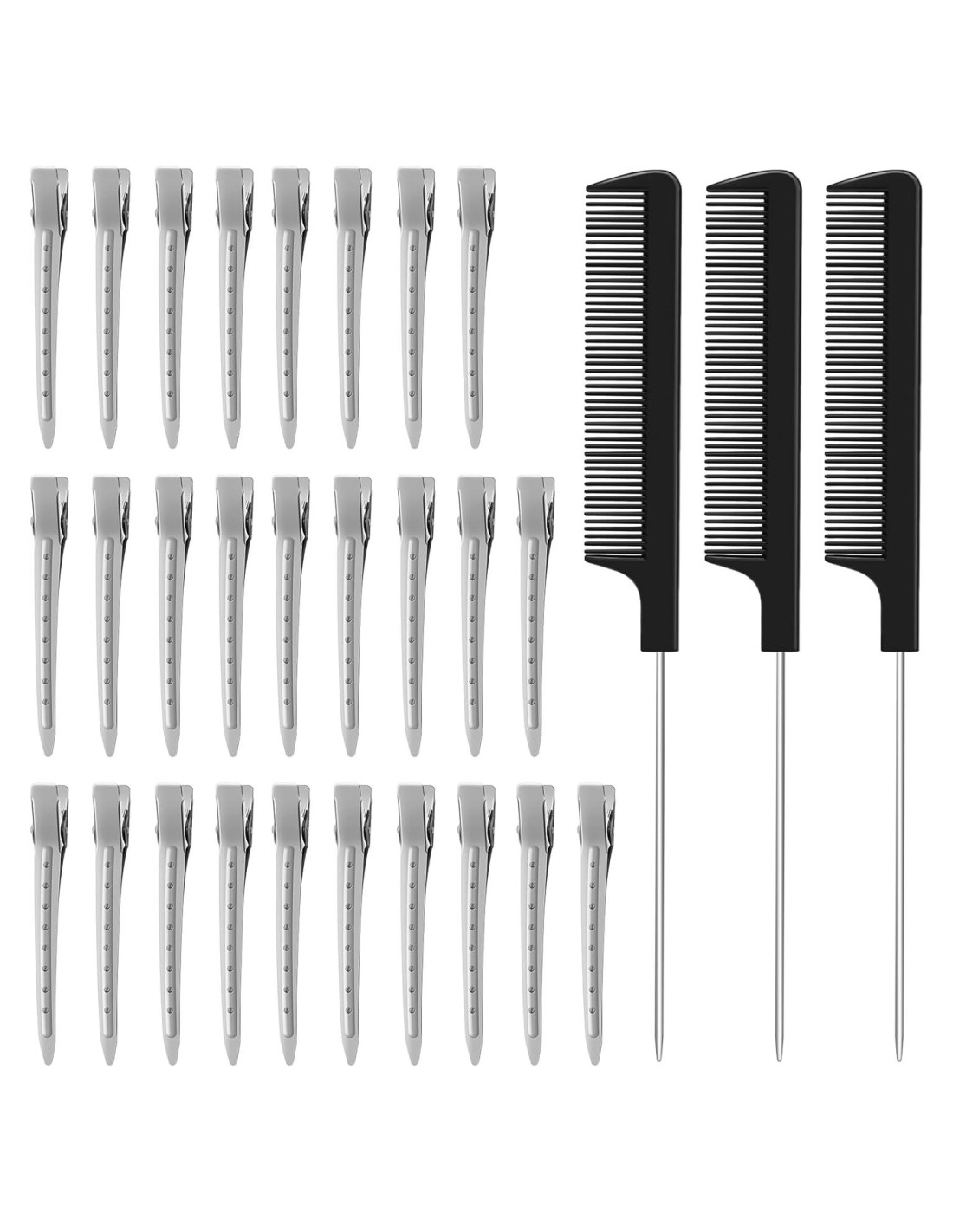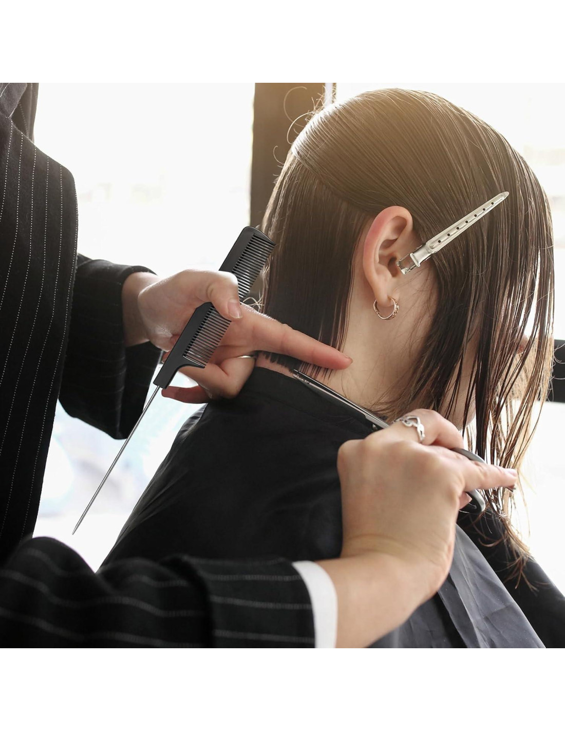 - TAMAÑO PERFECTO: 24 clips de pico de pato con 3 peines de cola de aguja negros, proporcionando suficiente cantidad para uso diario o en salón. La longitud del clip es de 3.5in (8.89 cm), perfecto para mantener el cabello en su lugar durante el corte, estilizado o al lavarte la cara. La longitud del peine de cola de aguja es de 8 5/8in (21.91 cm), el diseño de cola de aguja larga asegura una partición precisa para capas, trenzas o estilos rizados. Ideal para uso diario, profesionales de salón o proyectos de cabello DIY.