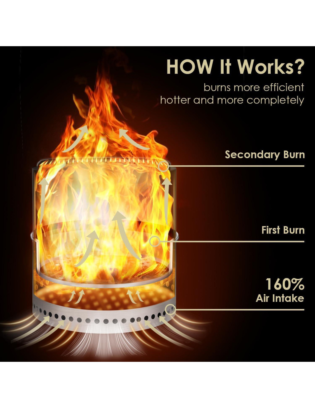 - [Tecnología Sin Humo] La hoguera GreenVines cuenta con cámaras duales y un sistema de combustión secundaria. Este diseño innovador atrae aire fresco y reinicia el humo en la cámara superior con un flujo de aire de 360 grados, eliminando el humo antes de que escape. Esta tecnología asegura un fuego prácticamente libre de humo, ofreciendo un impresionante aumento del 50% en la eficiencia de combustión en comparación con las hogueras sin humo típicas. Disfruta de un fuego más limpio y eficiente con GreenVines.