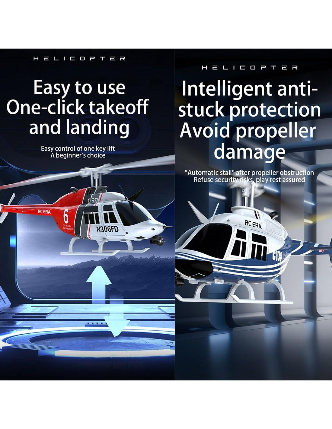 - [Características Avanzadas] El Helicóptero C138 está cargado con características avanzadas como alarma de bajo voltaje, protección contra atascos, protección contra pérdida de control, e incluso despegue y aterrizaje con un solo botón, logrando ascenso, descenso, movimiento hacia adelante, movimiento hacia atrás, vuelo a la izquierda, vuelo a la derecha, rotación a la izquierda, rotación a la derecha, vuelo por trayectoria y otras maniobras acrobáticas.