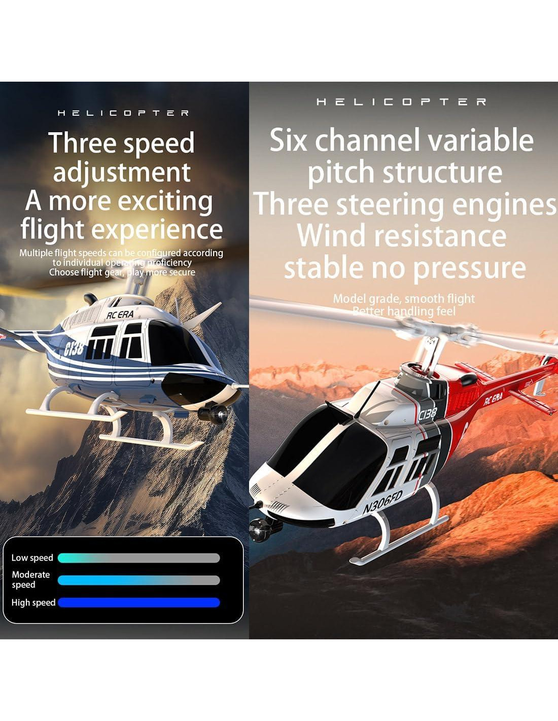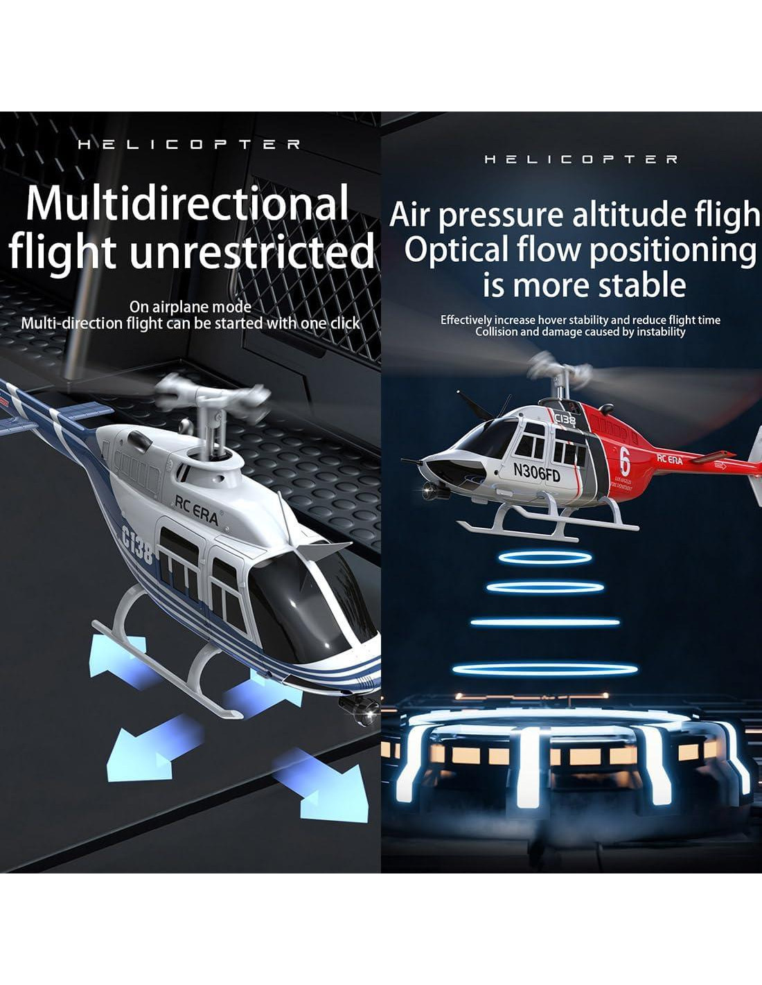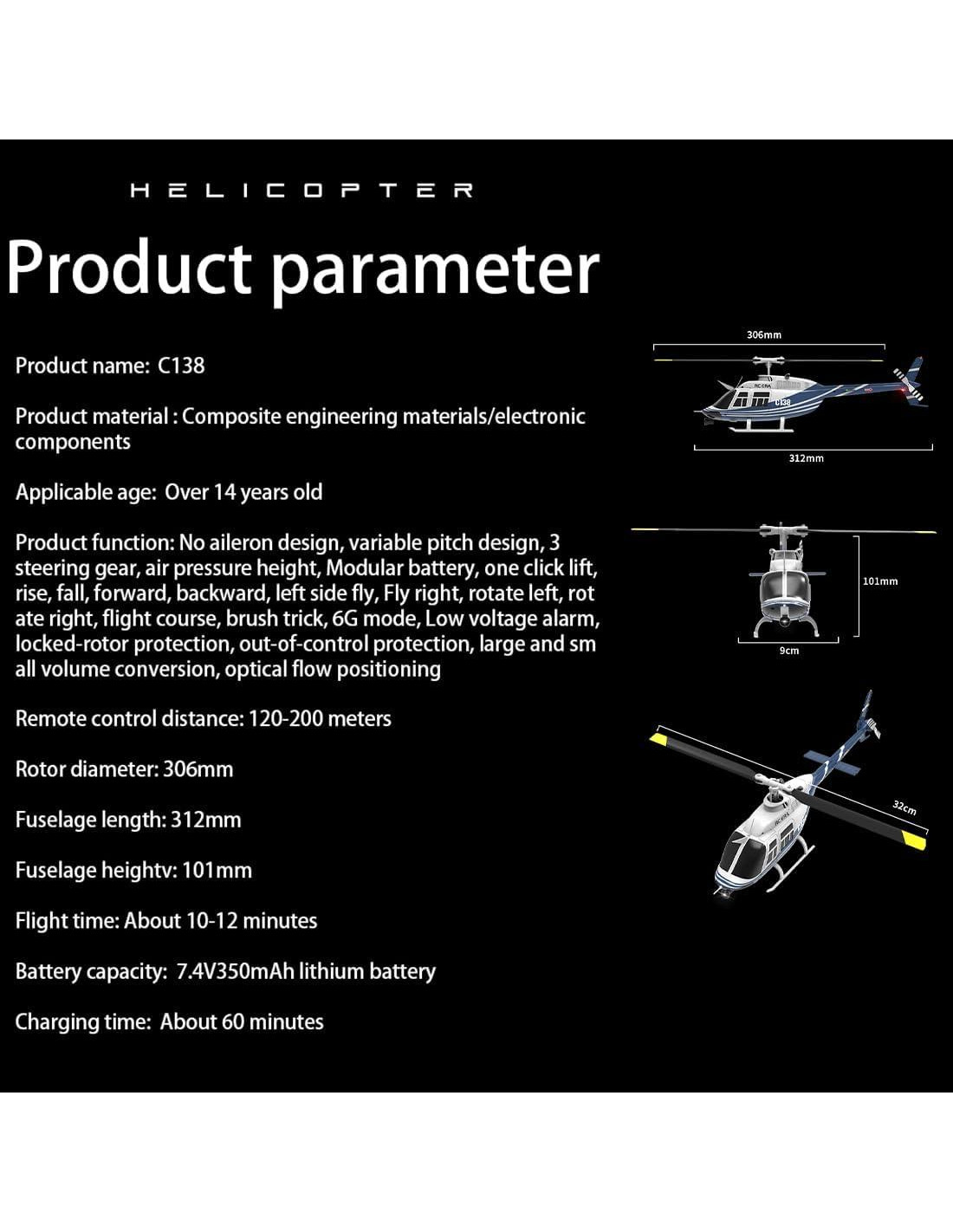 - [C138 Helicóptero RC ] Vuelo Estable, Diseñando hélices basadas en principios aerodinámicos, el C138 te tiene cubierto con un sistema de giroscopio de 6 ejes. Esta tecnología avanzada asegura un vuelo ultraestable, facilitando la realización de maniobras y acrobacias suaves.