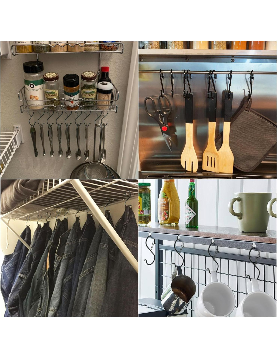 - FÁCIL DE USAR: Ambos lados se pueden usar para colgar artículos para satisfacer tus diferentes necesidades. Puedes usar los ganchos en S para colgar ollas y sartenes en estantes de almacenamiento, colgar macetas para plantas de interior, colgar comederos para aves en exteriores, colgar jeans en estantes de alambre de armario, colgar bolsas en organizadores de armario de alambre, colgar utensilios en parrillas de carbón, colgar marcos de fotos en estantes de almacenamiento apilables de rejilla de alambre, y también se pueden usar para colgar toallas de baño en estantes de ducha.