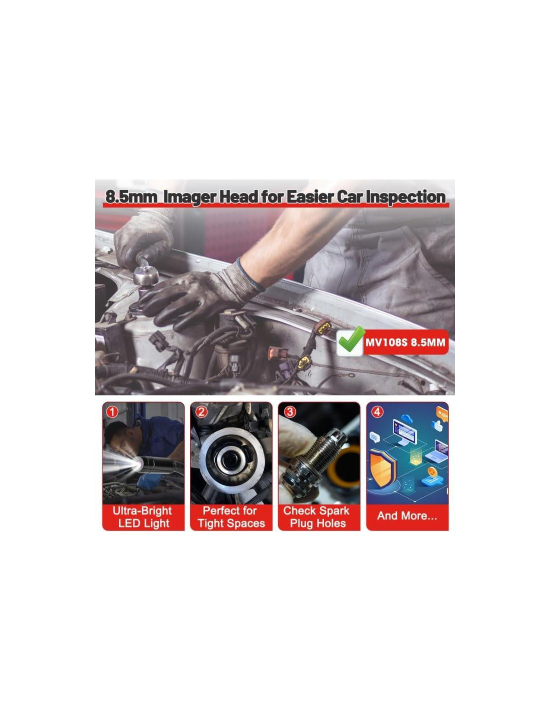 - [Mejor Experiencia de Inspección] ¿Quieres ver una cierta área del motor de tu automóvil, pero no quieres desarmarlo? El endoscopio de inspección Autel MaxiVideo MV108S te ayudará a inspeccionar libremente áreas normalmente inaccesibles, facilitando mucho la búsqueda de soluciones. Con LED superbrillante, Cabeza de Imagen de 8.5mm, se puede utilizar bien en espacios reducidos, la mayoría de los agujeros de bujías, cilindros de motor, inspecciones de piezas pequeñas, etc. En resumen, Autel MV108S está dedicado a hacer tu inspección más fácil.