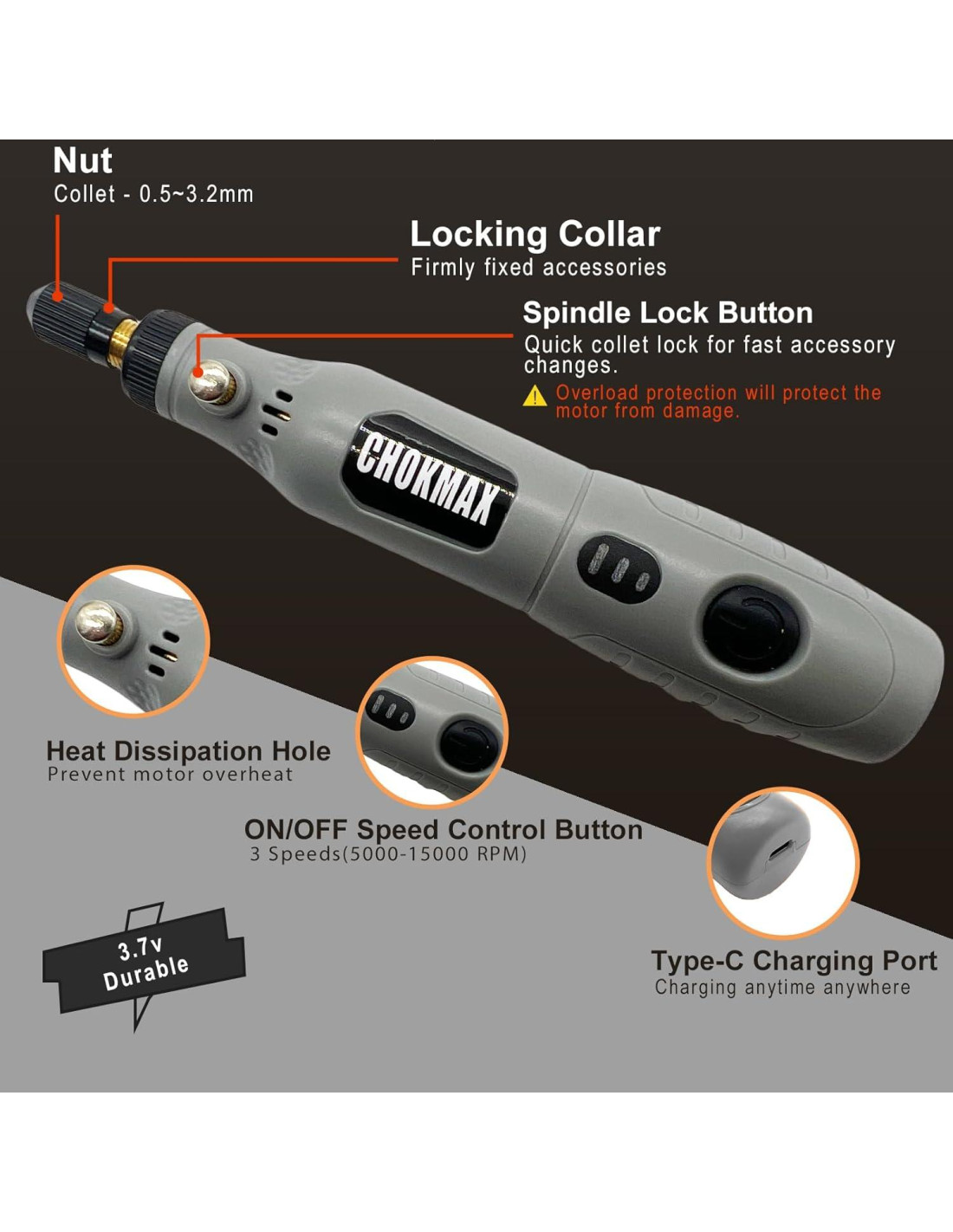 - CONECTOR USB PARA CARGA CÓMODA - Carga durante 2 horas para un trabajo continuo de 90 minutos, batería de litio recargable de 3.7 V para una operación segura y larga vida útil. Nuestra herramienta rotativa mini inalámbrica es alimentada por una batería de larga duración que asegura una operación ininterrumpida. ¡Disfruta de una creatividad ininterrumpida!