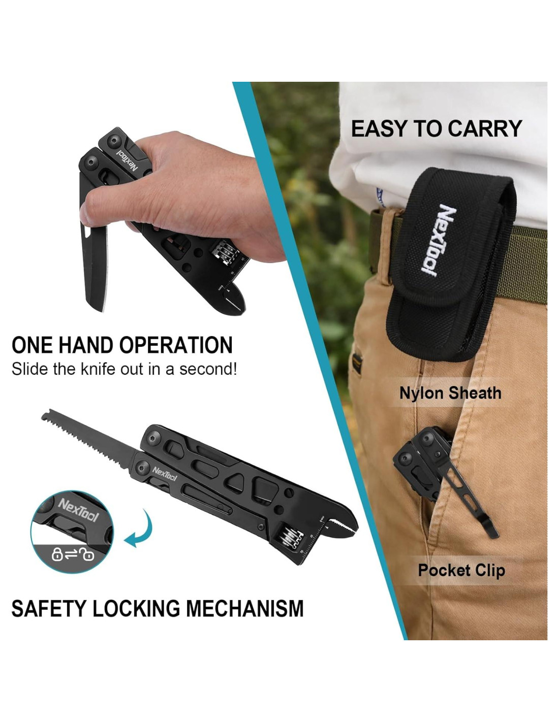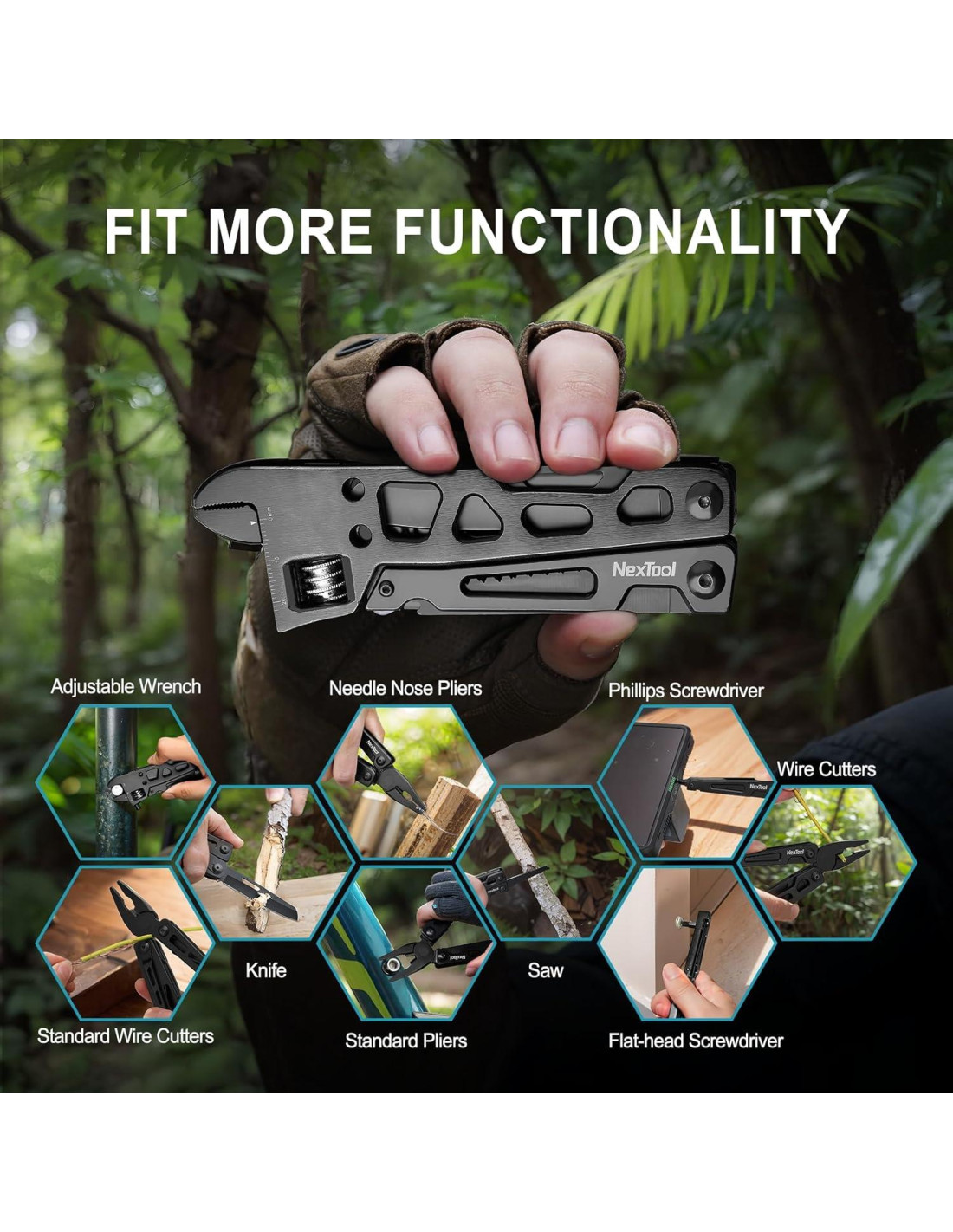 - MULTIHERRAMIENTA 9 EN 1: NexTool combina ingeniosamente la llave ajustable y las pinzas multifuncionales en una herramienta, cuenta con pinzas de punta fina, pinzas estándar, cortadores de alambre, cuchillo de bolsillo, sierra para madera, destornillador de estrella y destornillador plano. Esta multiherramienta de llave ajustable es accesible con una mano, con 9 tipos de funciones prácticas, es igual a un conjunto de caja de herramientas integrada, fácil de manejar las necesidades de atornillar, girar, enroscar, cortar, pelar, serrar, etc. en la vida diaria.