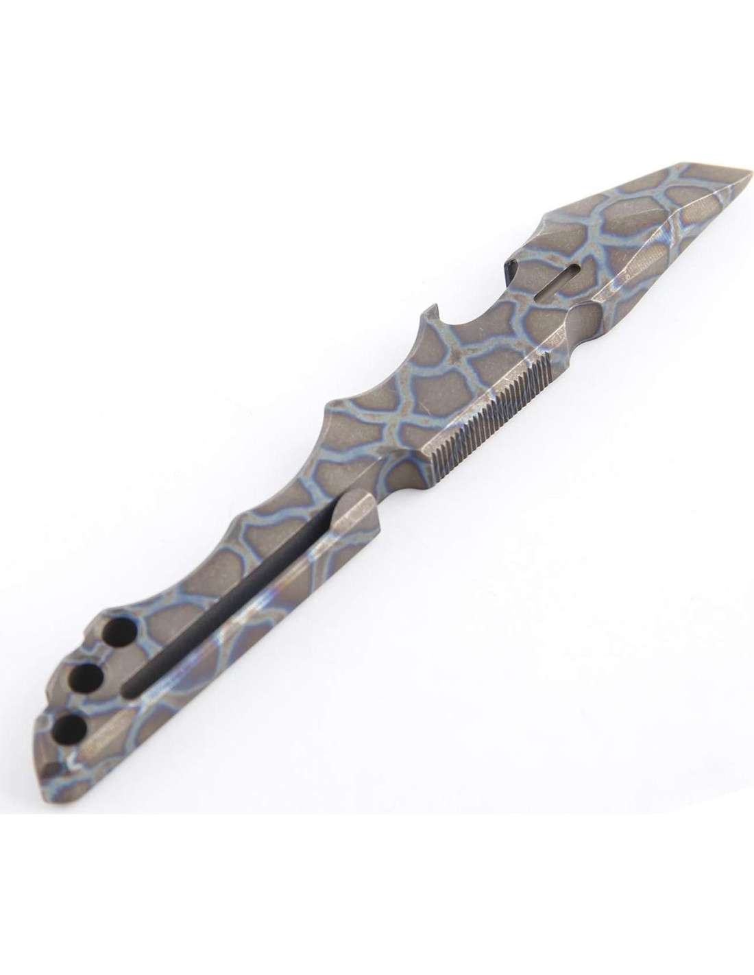 Marca: Fanycs Material: aleación de titanio TC4 Tratamiento de superficie: titanio azul quemado lavado a piedra Longitud total: 118mm (4.65 pulgadas) Grosor: 8mm (0.31 pulgadas) Ancho: ~15mm (0.59 pulgadas) Peso neto: ~25g (0.88 onzas) La posición de sujeción del dedo índice y el pulgar añade ranura antideslizante.