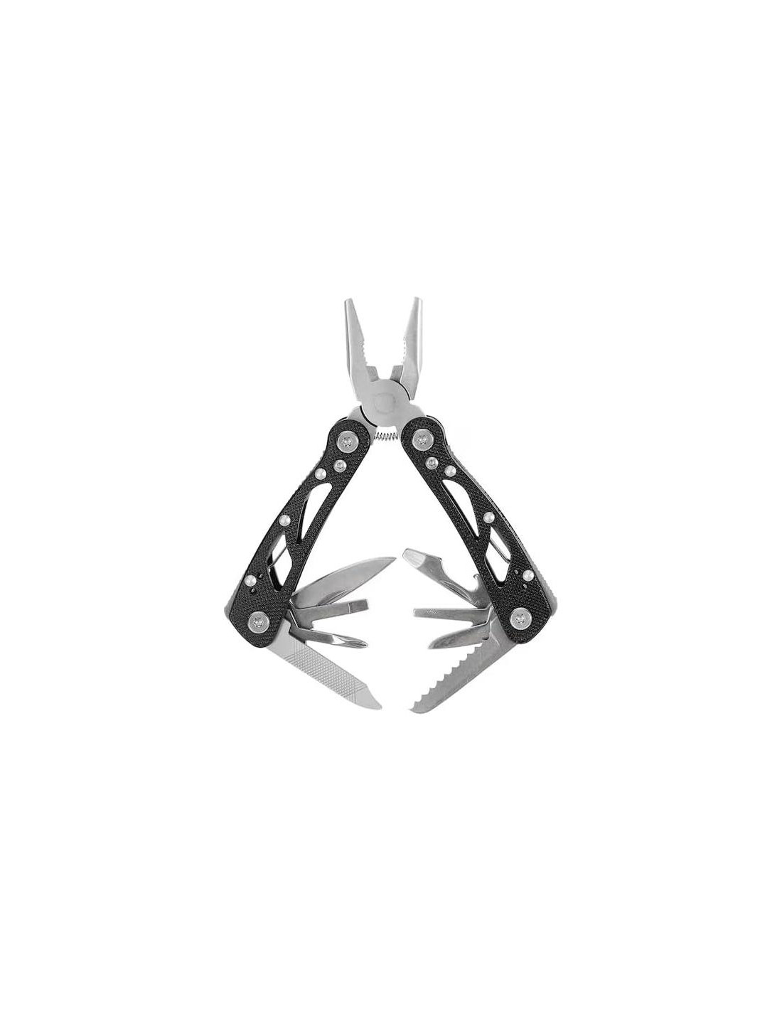 - Incluye: Alicates regulares, alicates de punta fina, cortador de alambre, destornillador plano mediano, destornillador Phillips, cuchillo, lima de metal, limpiador de uñas, destornillador plano grande, abridor de botellas, destornillador plano mini, sierra para madera, punzón.