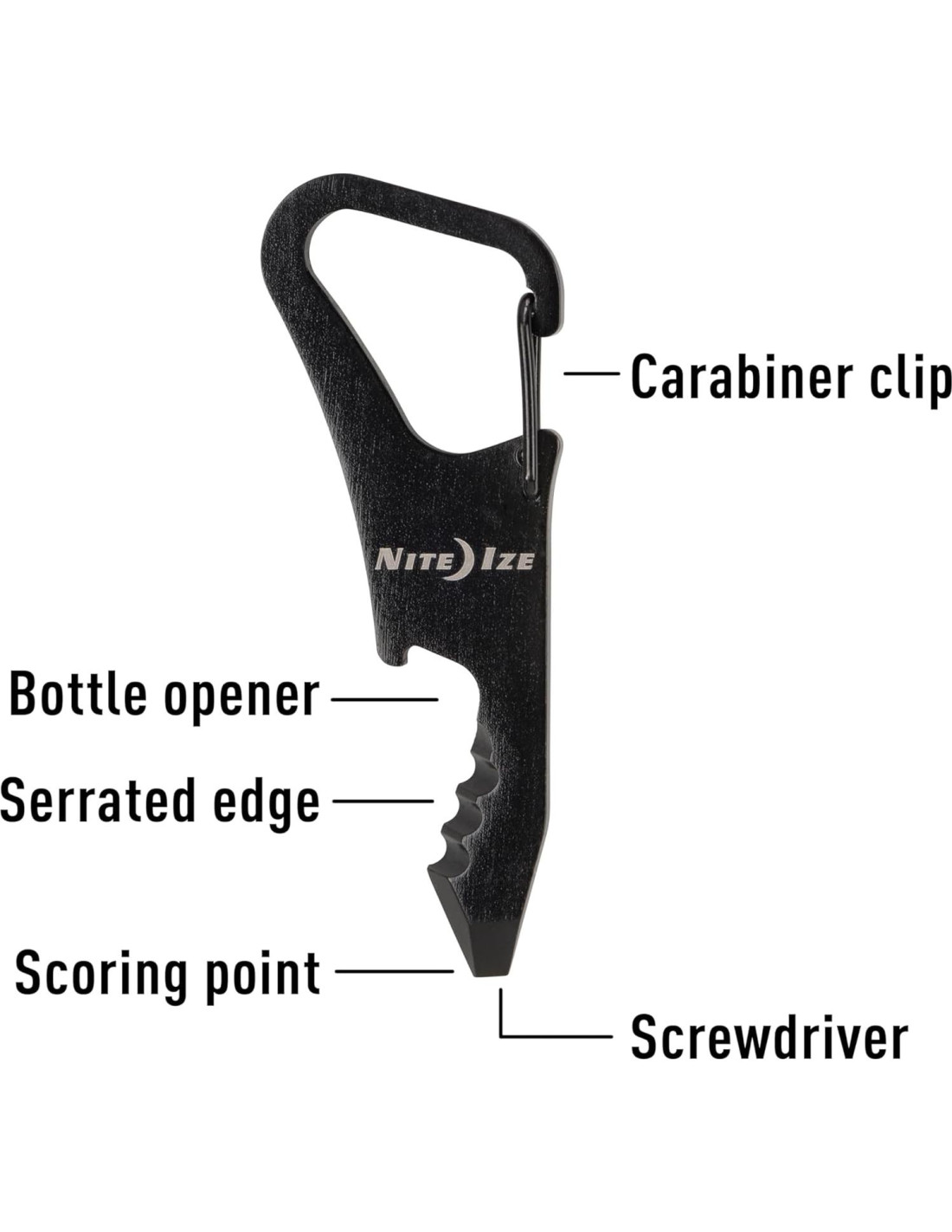 Mide 2 3/4" (6.99 cm) en total. Construcción de acero inoxidable con acabado negro. Las herramientas incluyen: abridor de botellas, borde serrado, punto de puntuación, destornillador ranurado o Phillips #2, y clip de carabiner. Empaque colgante.